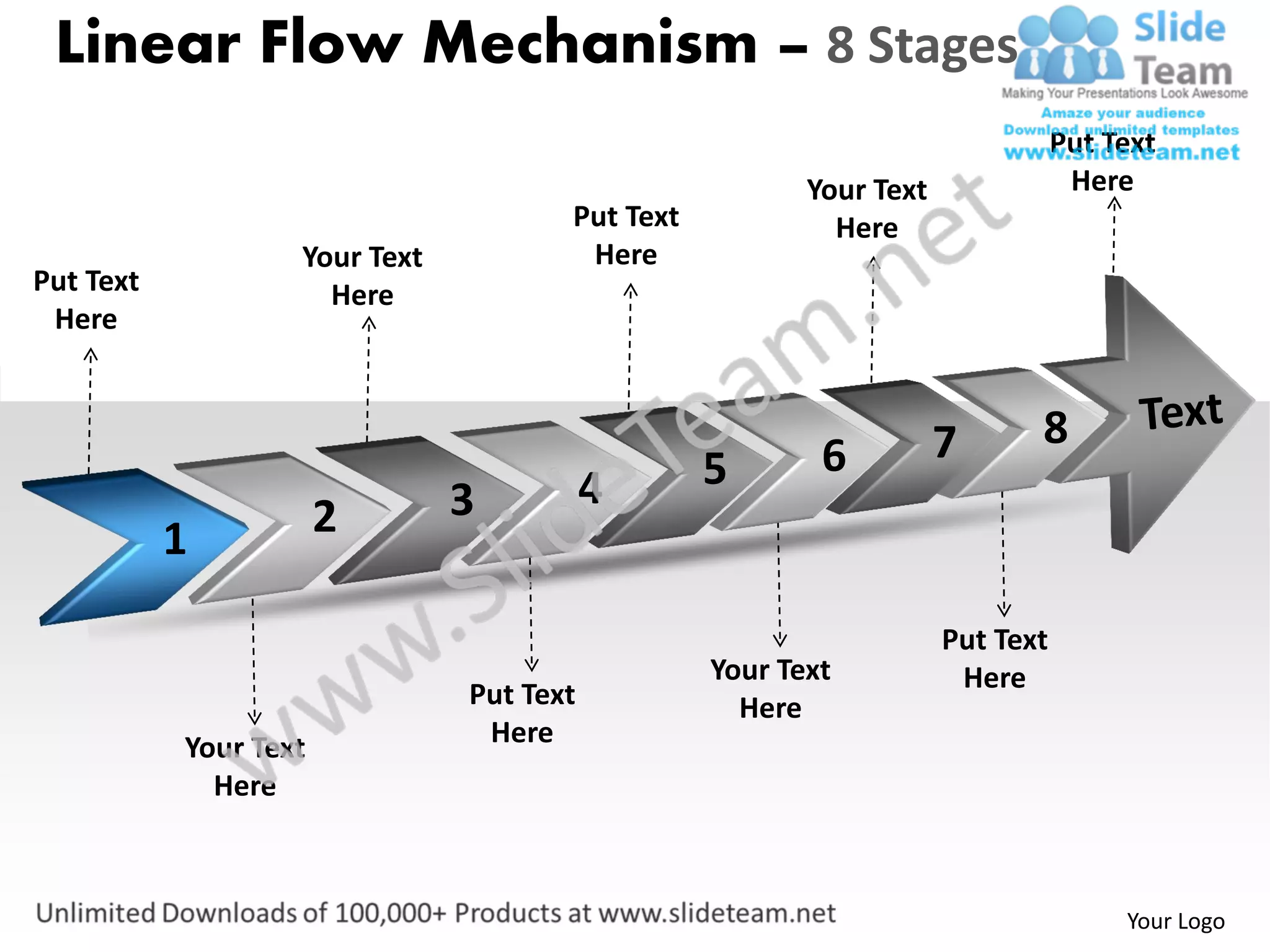 The document describes an 8-stage linear flow mechanism. Each stage is represented by a box that can be edited in PowerPoint by ungrouping objects, changing colors using theme colors or solid/gradient fills, and adjusting the size and orientation of icons. All images are fully editable to customize the mechanism to one's liking.