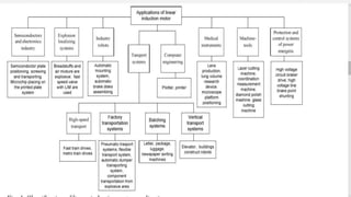 The document discusses the fundamentals of machines and motors, with a focus on induction motors and linear induction motors (LIM). It covers their construction, principles of operation, various types, characteristics, and applications in real-world scenarios. The conclusion emphasizes the importance of linear motion technology in advancing industrial capabilities and economic development.