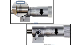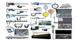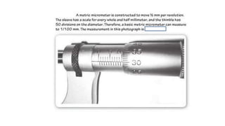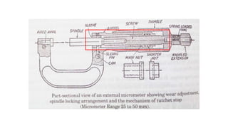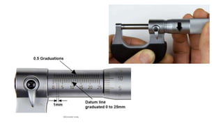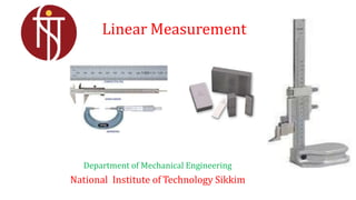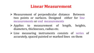 This document discusses various instruments used for linear measurement. It describes graduated instruments like vernier calipers and micrometers that use vernier principles to improve accuracy. Vernier calipers and micrometers are described in detail, including their construction, working principle, and how to take measurements. Limit gauges and slip gauges are also summarized, with limit gauges used to check if a part meets specified size limits and slip gauges used as precision length standards.