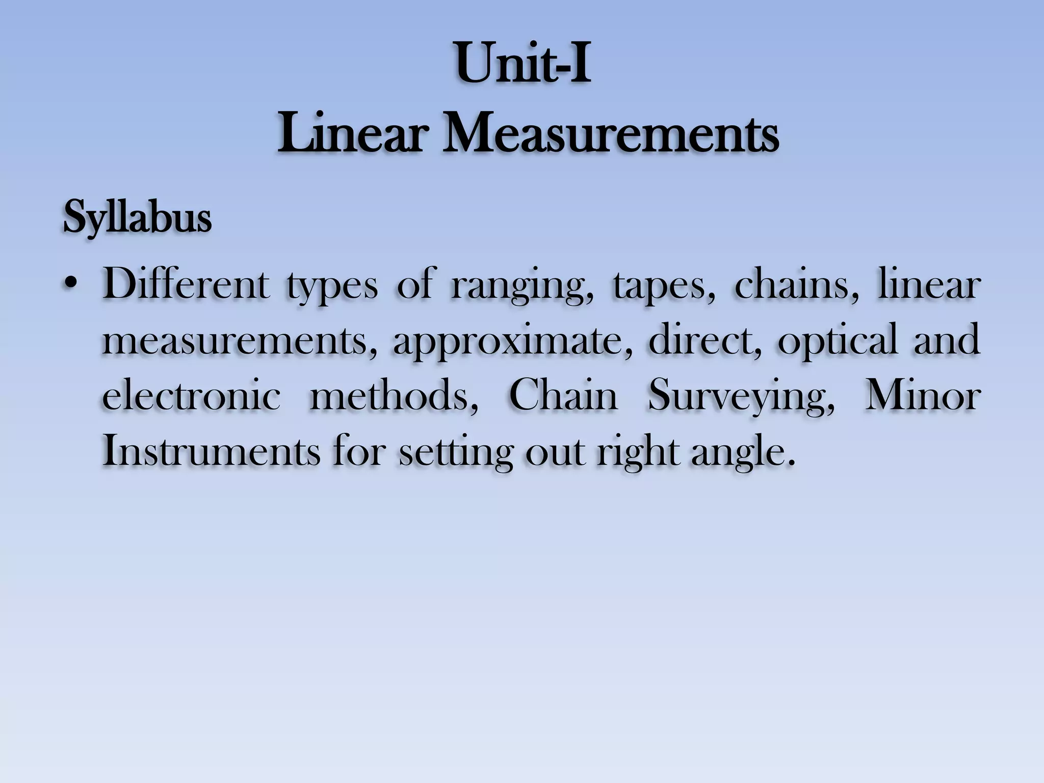 This document provides an overview of linear measurements and chain surveying techniques. It discusses different types of ranging methods, including direct and reciprocal ranging, to locate intermediate points along a survey line. It also describes instruments used for chain surveying, such as different types of chains, tapes, arrows, ranging rods, and plumb bobs. The key principle of chain surveying is that it involves measuring the sides of triangles within the survey area using a chain or tape, without taking any angular measurements.