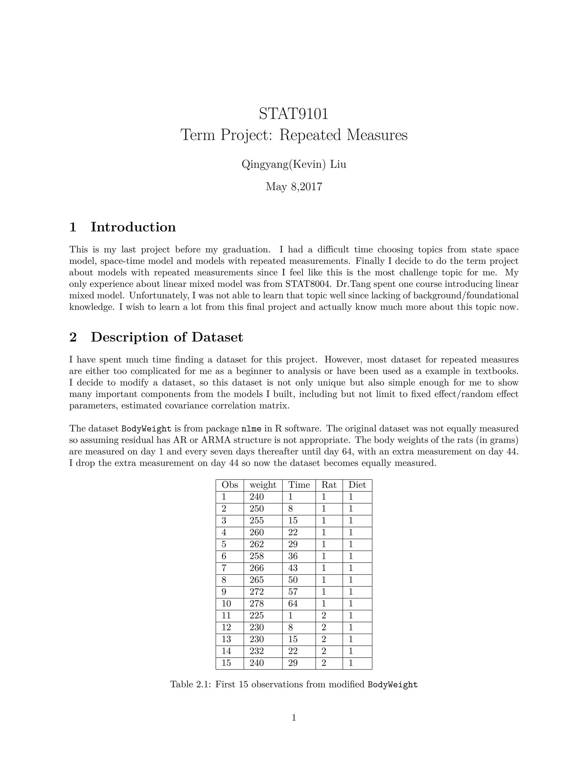 This document describes a student's term project analyzing a repeated measures dataset on rat body weights over time under different diets. The student builds several linear mixed models to analyze the data, starting with a basic fixed effects model with uncorrelated residuals, then improving the model by assuming correlated residuals within each rat. For the best fitting model, an unstructured covariance matrix is estimated to model the residual correlations decaying over time. Model selection is performed using information criteria and likelihood ratio tests.