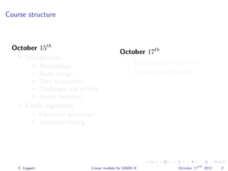 This document summarizes a lecture on linear mixed models for genome-wide association studies. The lecture covers using linear mixed models to correct for population structure in GWAS. It discusses estimating model parameters and variance components to account for population stratification, family structure, and cryptic relatedness in order to avoid false positive associations. The lecture also reviews related probability concepts like joint, marginal and conditional probability, Bayes' theorem, and Gaussian distributions.