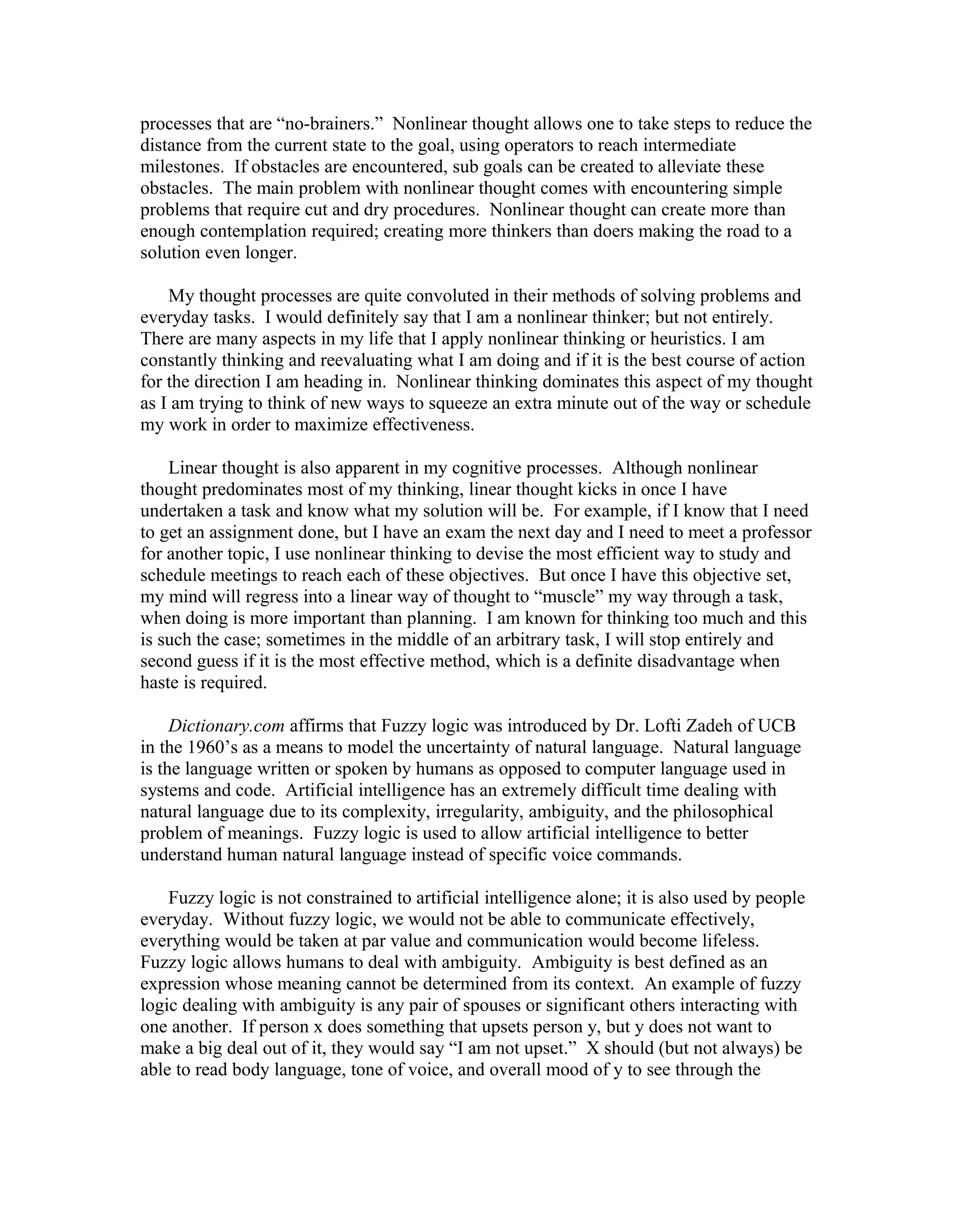 Linear thinking is straightforward and follows a direct path to solve problems, while nonlinear thinking considers alternative approaches and hidden meanings. Fuzzy logic allows for ambiguity and dealing with true meanings that are not clearly stated. The document discusses how these different thought processes - linear, nonlinear, and fuzzy logic - are used in everyday life and thinking. The author thinks nonlinearly to plan solutions but linearly to implement them, and uses fuzzy logic to understand true meanings behind ambiguous statements.