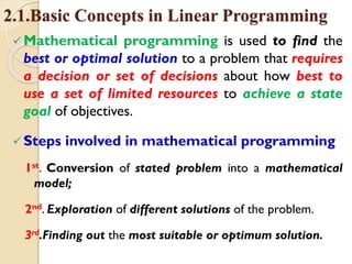 1. It describes the basic concepts of linear programming, such as decision variables, constraints, and the objective function needing to be linear.