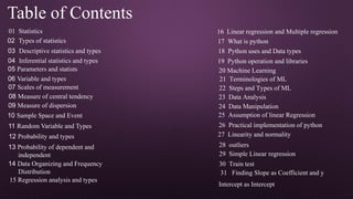 The document discusses the application of linear regression in machine learning, providing a detailed overview of statistical concepts, types of statistics, and the steps involved in data analysis and manipulation. It covers Python programming basics, including data types, operations, and libraries, as well as practical implementations of regression analysis. Additionally, it emphasizes the importance of assumptions in linear regression and the use of various methods for model evaluation.