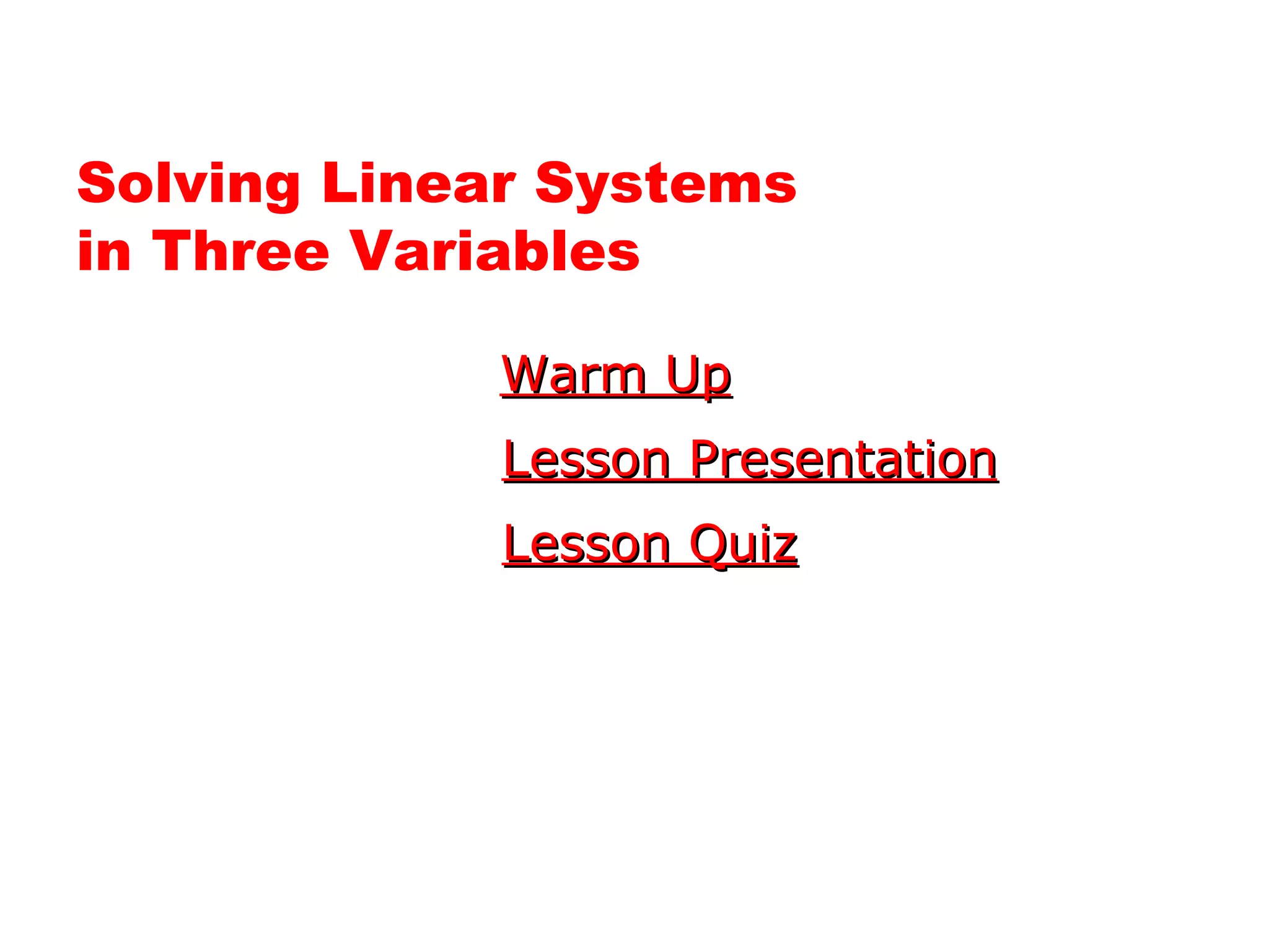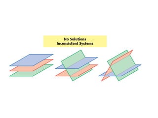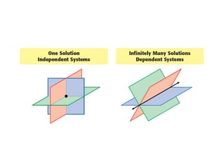 This document provides examples for solving systems of linear equations in three variables. It begins with an example using elimination to solve the system 5x - 2y - 3z = -7, etc. step-by-step, reducing it to a 2x2 system and solving for x, y, and z. The next example uses substitution to solve a word problem about ticket sales. It shows setting up and solving a 3x3 system. The document concludes with an example of a system having an infinite number of solutions.