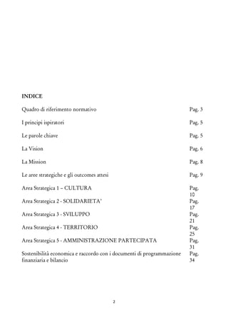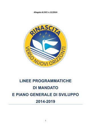 Il documento delinea le linee programmatiche di mandato e il piano generale di sviluppo per il Comune di Cassano delle Murge per il periodo 2014-2019, centrato su principi di cultura, solidarietà, sviluppo, territorio, e amministrazione partecipata. Si enfatizza l'importanza della partecipazione dei cittadini e della qualità della vita, stabilendo obiettivi strategici per promuovere un'offerta culturale, migliorare l'istruzione e favorire una crescita economica sostenibile. La missione dell'amministrazione è di garantire uno sviluppo armonico del territorio, valorizzando le risorse pubbliche e coinvolgendo attivamente la comunità nei processi decisionali.