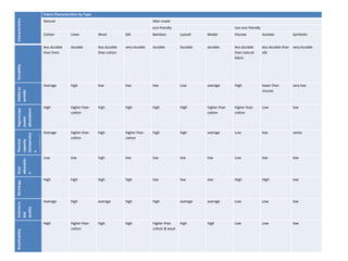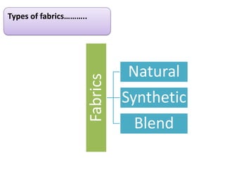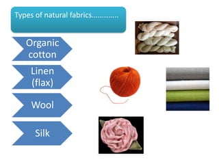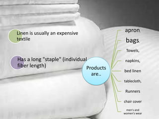 This document discusses different types of fabrics used in hotels, including natural fabrics like linen, cotton, silk, and wool as well as man-made eco-friendly fabrics like bamboo and lyocell. It describes the characteristics of linen and how it is used in hotels for items like bedding, throws, and cushions. The document also discusses fabric construction methods like weaving and finishing processes like dyeing and sewing that are used to prepare fabrics for their end use.