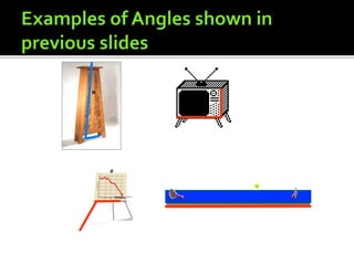 This document defines and provides examples of lines, angles, and the relationships between them. It explains that two points are needed to draw a line, which can be a line segment or ray. Lines can intersect or be parallel. Angles are formed by two rays with a common endpoint, and types of angles include acute, obtuse, right, straight, and reflex. The document also defines complementary angles, supplementary angles, adjacent angles, corresponding angles, vertical opposite angles, alternate interior angles, and alternate exterior angles.