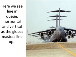 The document discusses different types of lines used in images, including curvilinear, organic, geometric, horizontal, vertical, diagonal, and skewed lines. Lines are described as creating movement, direction, structure, repetition, volume, continuity, and establishing a sense of space. Specific examples mentioned include lines formed by trees, fences, buildings, and birds flying in a line.