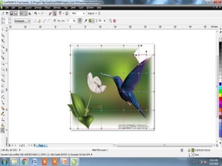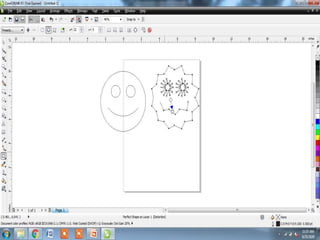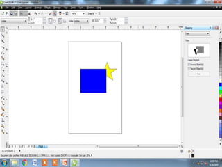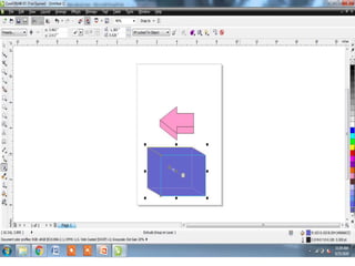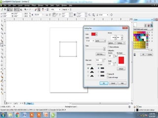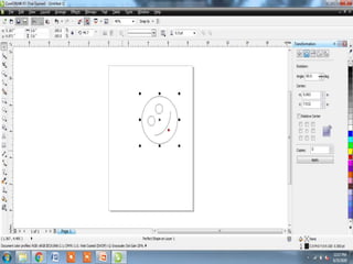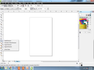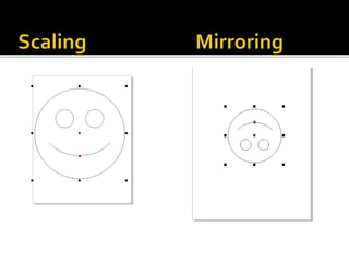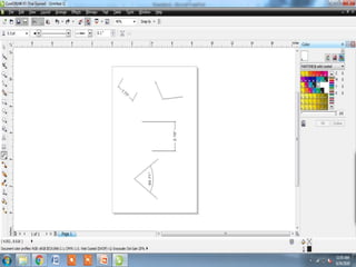 The document outlines various tools and techniques for creating and modifying lines, shapes, and objects in graphic design software. It covers dimension lines, trimming, intersecting objects, and applying effects like transparency, shadows, and perspective. Additionally, it explains the use of the transformation docker for positioning, scaling, and rotating objects.