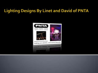 Linet and Dave are lighting designers with experience in theater, dance, music, and corporate events. Linet's work has been praised for its "delicate, sensitive lighting" and "dramatic lighting creating a ritualistic, reflective tone." Dave has received excellence awards for his theatrical designs and praise for the "high production value" of his work. Together they have designed lighting and video for many local fashion shows and events. Both can conceptualize, design, plot, and cue an entire show.