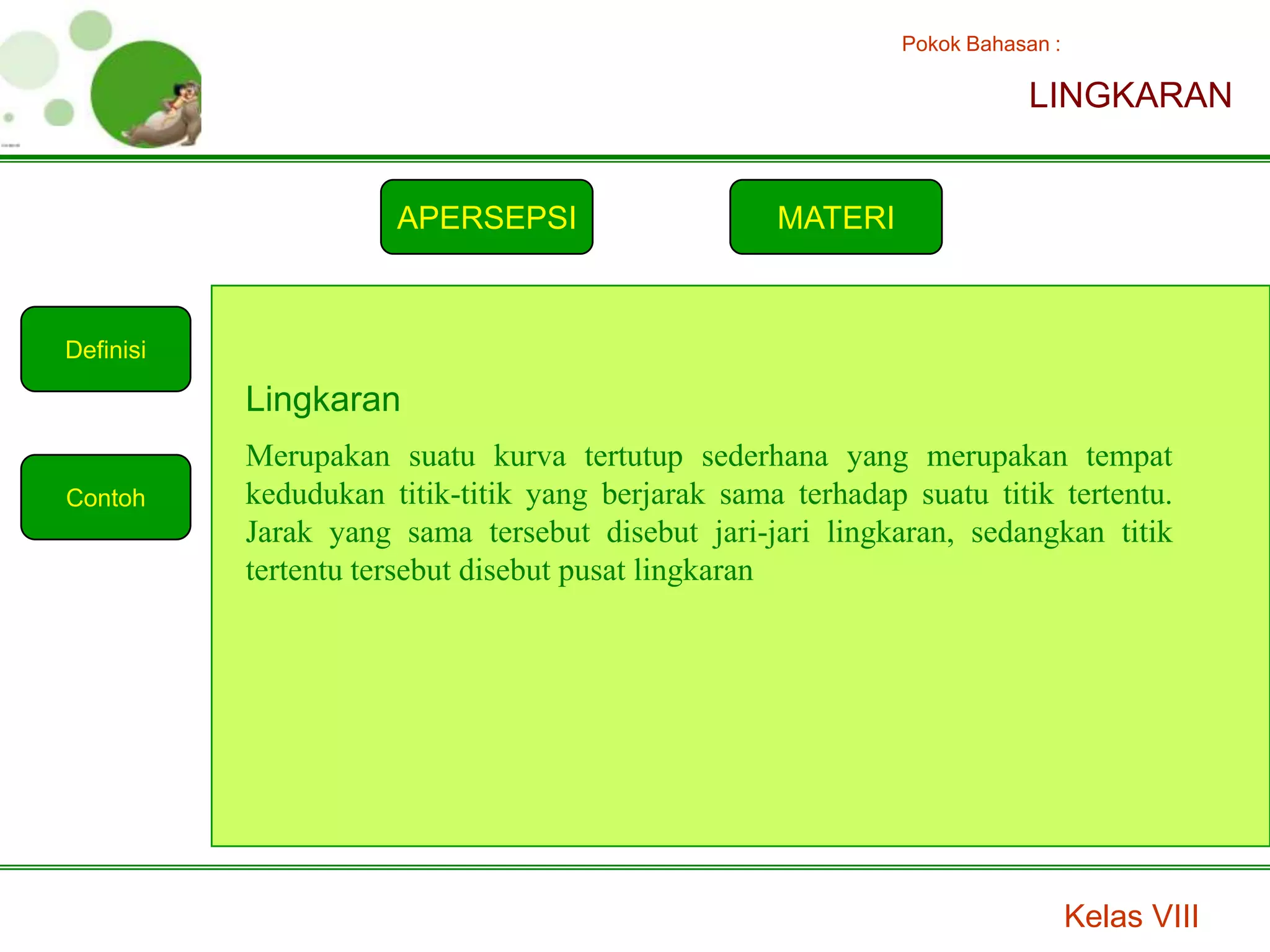 Dokumen ini menjelaskan materi tentang lingkaran untuk kelas VIII, termasuk definisi, unsur-unsur seperti jari-jari, pusat, dan diameter, serta rumus untuk menghitung keliling dan luas lingkaran. Juga diuraikan langkah-langkah kegiatan praktis untuk menemukan nilai π dan mengukur lingkaran. Hasil kegiatan menunjukkan bahwa rata-rata (keliling ÷ diameter) mendekati nilai π, yang digunakan untuk rumus keliling dan luas lingkaran.