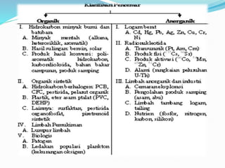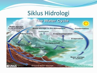 Dokumen ini membahas siklus hidrologi, akses dan kebutuhan air di negara berkembang, serta dampak kesehatan dari air yang tercemar. Ia menguraikan peraturan tentang kualitas air minum di Indonesia dan menjelaskan penyakit yang terkait dengan air, termasuk penyebarannya melalui mikroba patogen. Sumber pencemar air juga diidentifikasi, mencakup limbah cair industri dan domestik, serta pengaruhnya terhadap kesehatan manusia.