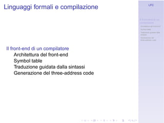 Il documento tratta del front-end di un compilatore, evidenziando i suoi componenti principali come l'analizzatore lessicale, il parser, la symbol table e il generatore di codice intermedio, che lavorano insieme per tradurre il codice sorgente in un formato intermedio chiamato three-address code. Viene inoltre discusso il ruolo significativo dei token e della symbol table, necessari per l'analisi sintattica e per garantire la corretta dichiarazione e utilizzo delle variabili nel codice. Si sottolinea l'importanza dei controlli semantici e delle regole di scoping all'interno della compilazione.