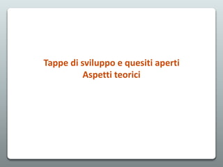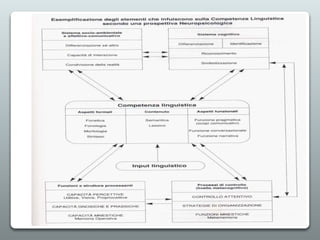 Il documento analizza lo sviluppo del linguaggio nell'età evolutiva, descrivendo le tappe di sviluppo e i fenomeni psicopatologici legati a questo processo. Si discutono le teorie sull'acquisizione del linguaggio, evidenziando la complessità e l'interazione tra componenti linguistiche e cognitive. Vengono anche presentate importanti acquisizioni universali e metodologie per stimolare la comunicazione nei bambini.