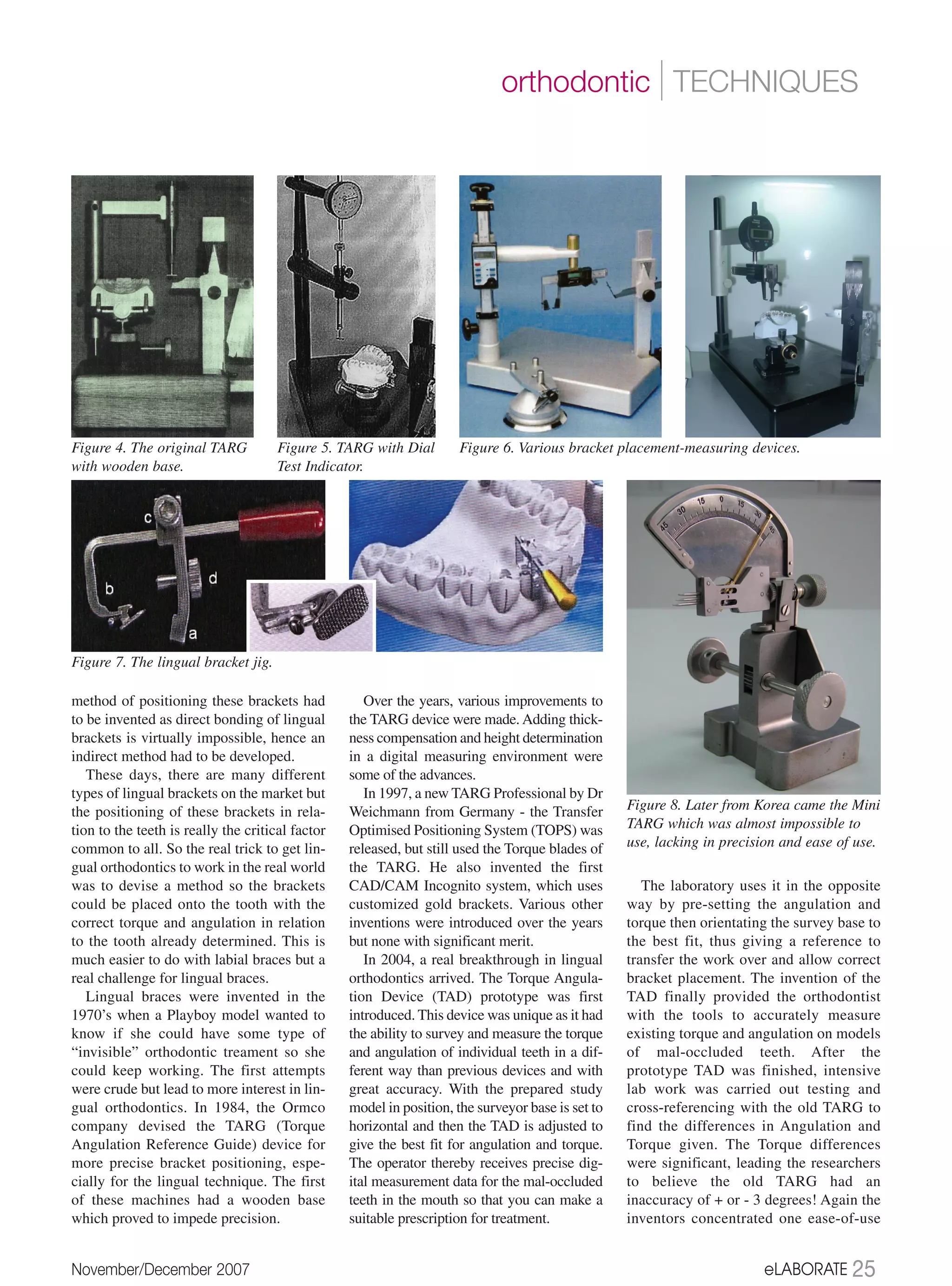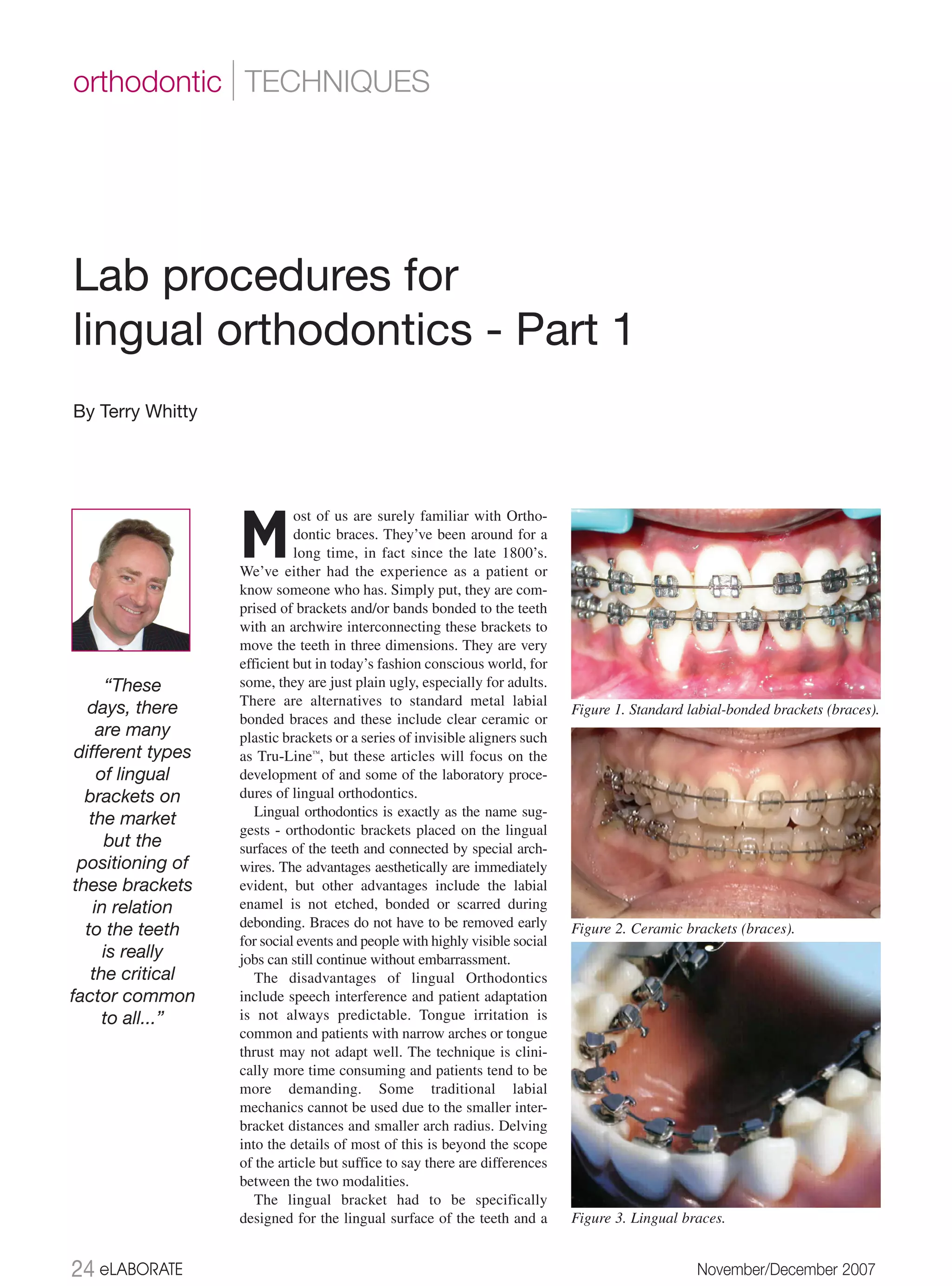 The document discusses advances in lingual orthodontics, specifically focusing on the development of specialized brackets and techniques for better positioning and measurement. It highlights the aesthetic and functional advantages of using lingual braces over traditional labial braces, while also addressing the challenges such as speech interference and adaptation difficulties. Notable innovations include the introduction of the Torque Angulation Device (TAD) and Bracket Placement Device (BPD) to improve accuracy in bracket placement and treatment outcomes.
