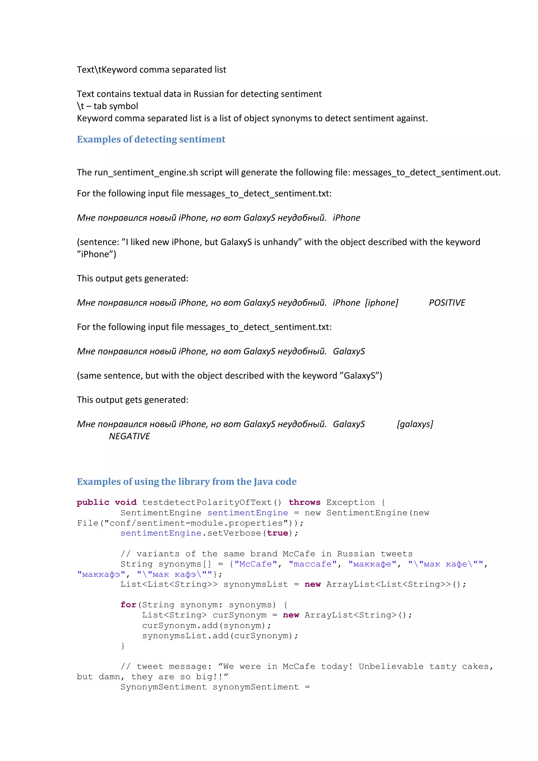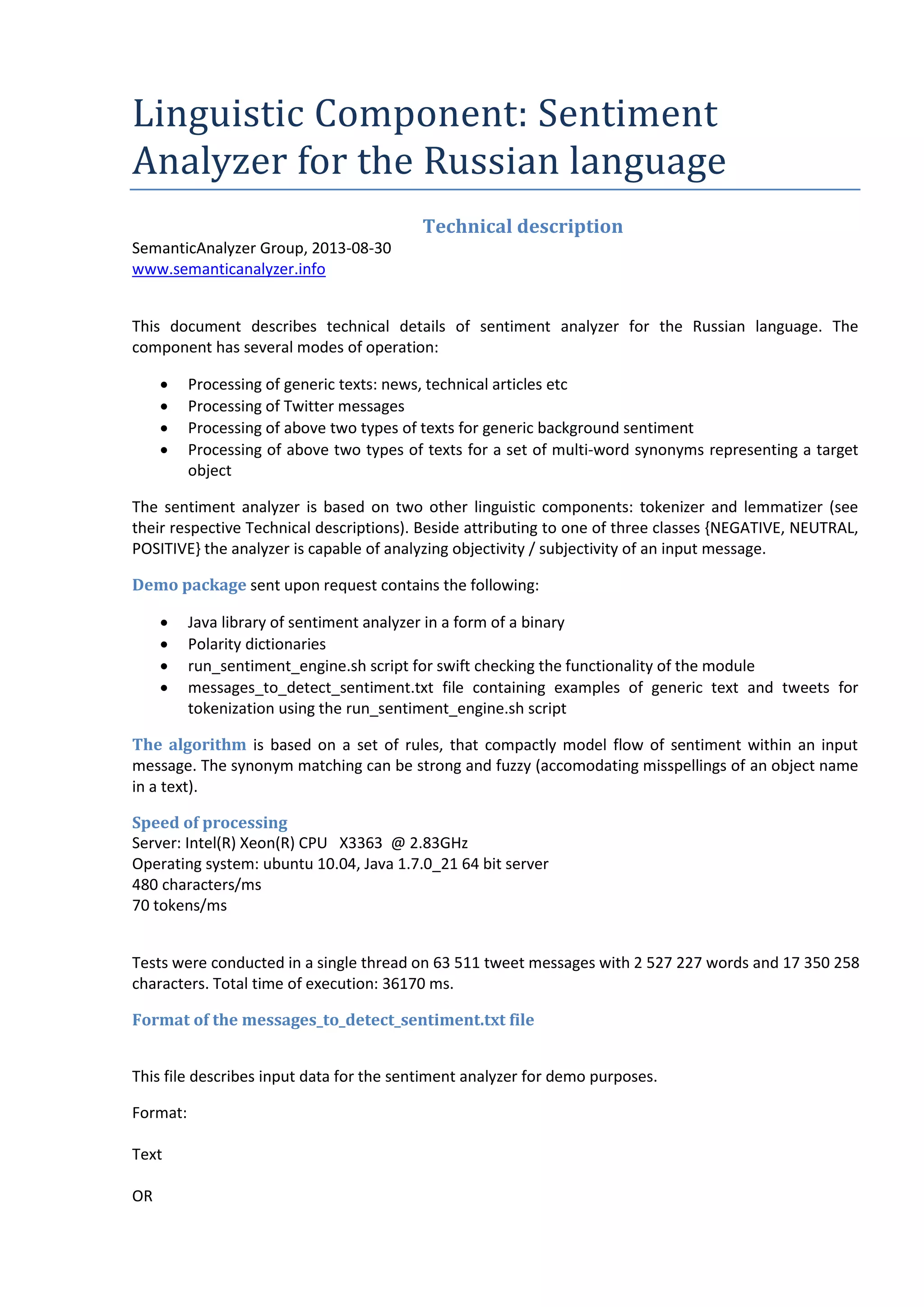 The document details a sentiment analyzer specifically designed for the Russian language, which can process various text types and assess sentiment as negative, neutral, or positive. It operates using a set of rules and supports synonym matching for enhanced accuracy, with a demo package available for testing. Performance metrics are provided, highlighting its processing capabilities on different text formats including generic news articles and social media messages.