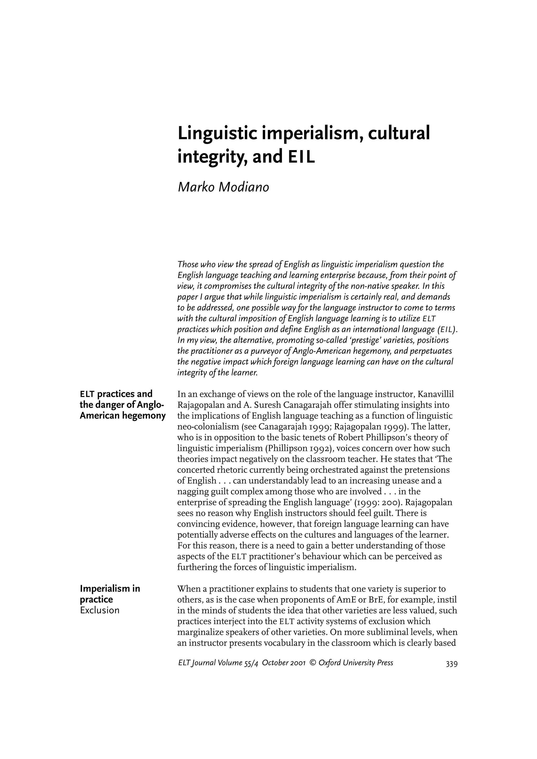 This document discusses the relationship between English language teaching (ELT) and cultural imperialism. It argues that promoting certain prestigious varieties of English over others can perpetuate Anglo-American dominance and negatively impact learners' cultural integrity. However, positioning English as an international language (EIL) that belongs equally to all its speakers may help address this issue. The document also examines how insistence on near-native proficiency and culture-specific teaching methods can impose foreign cultural norms and undermine learners' own identities and cultural diversity more broadly.