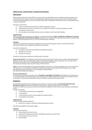 O documento resume os principais movimentos artísticos entre os séculos XVIII e XIX, incluindo o Neoclassicismo, Romantismo, Realismo e Impressionismo. O Neoclassicismo enfatizou a imitação dos modelos clássicos gregos e romanos. O Romantismo valorizou a expressão individual do artista e temas nacionais. O Realismo buscou retratar a realidade de forma objetiva. O Impressionismo focou na representação dos efeitos da luz.