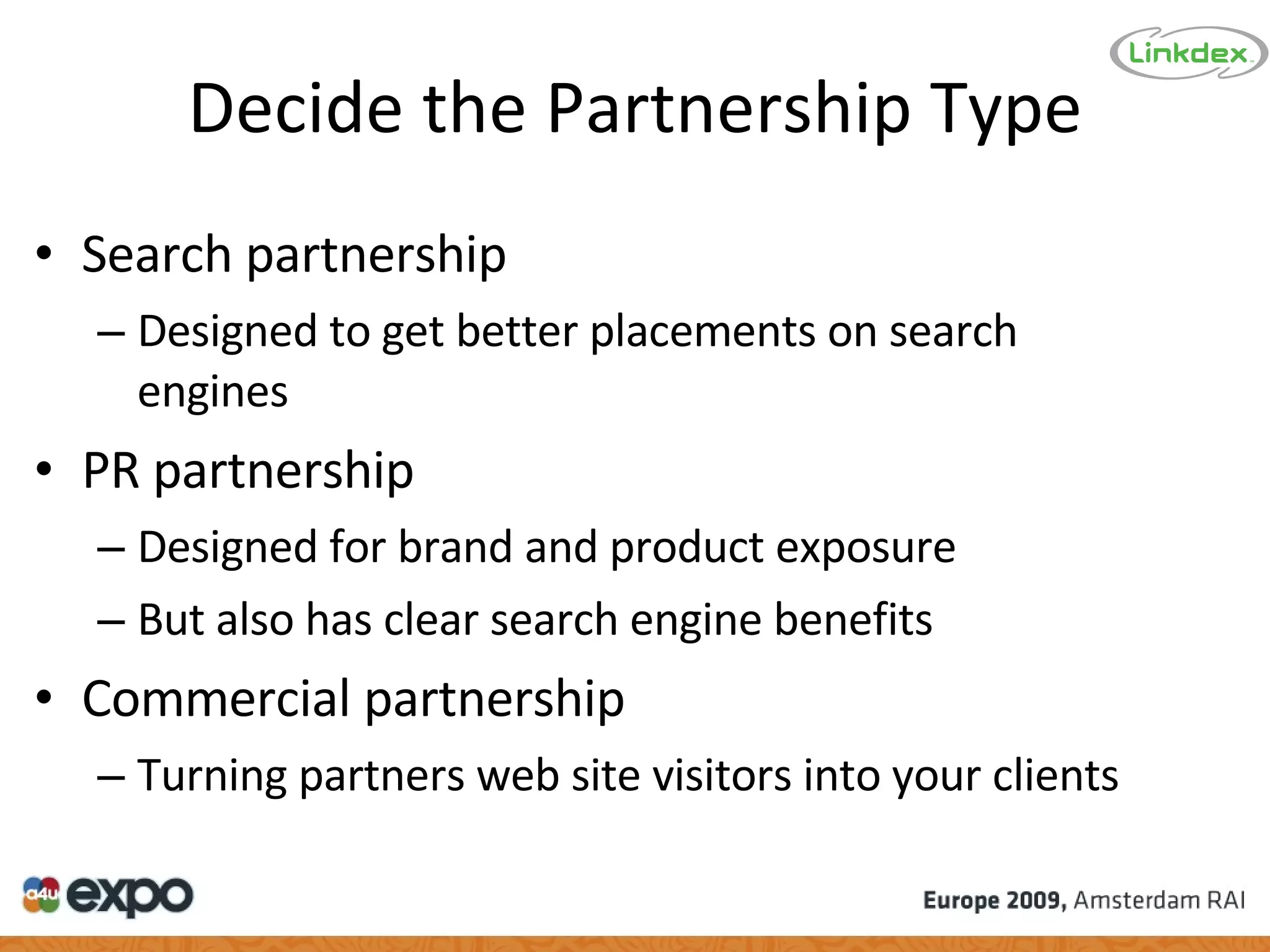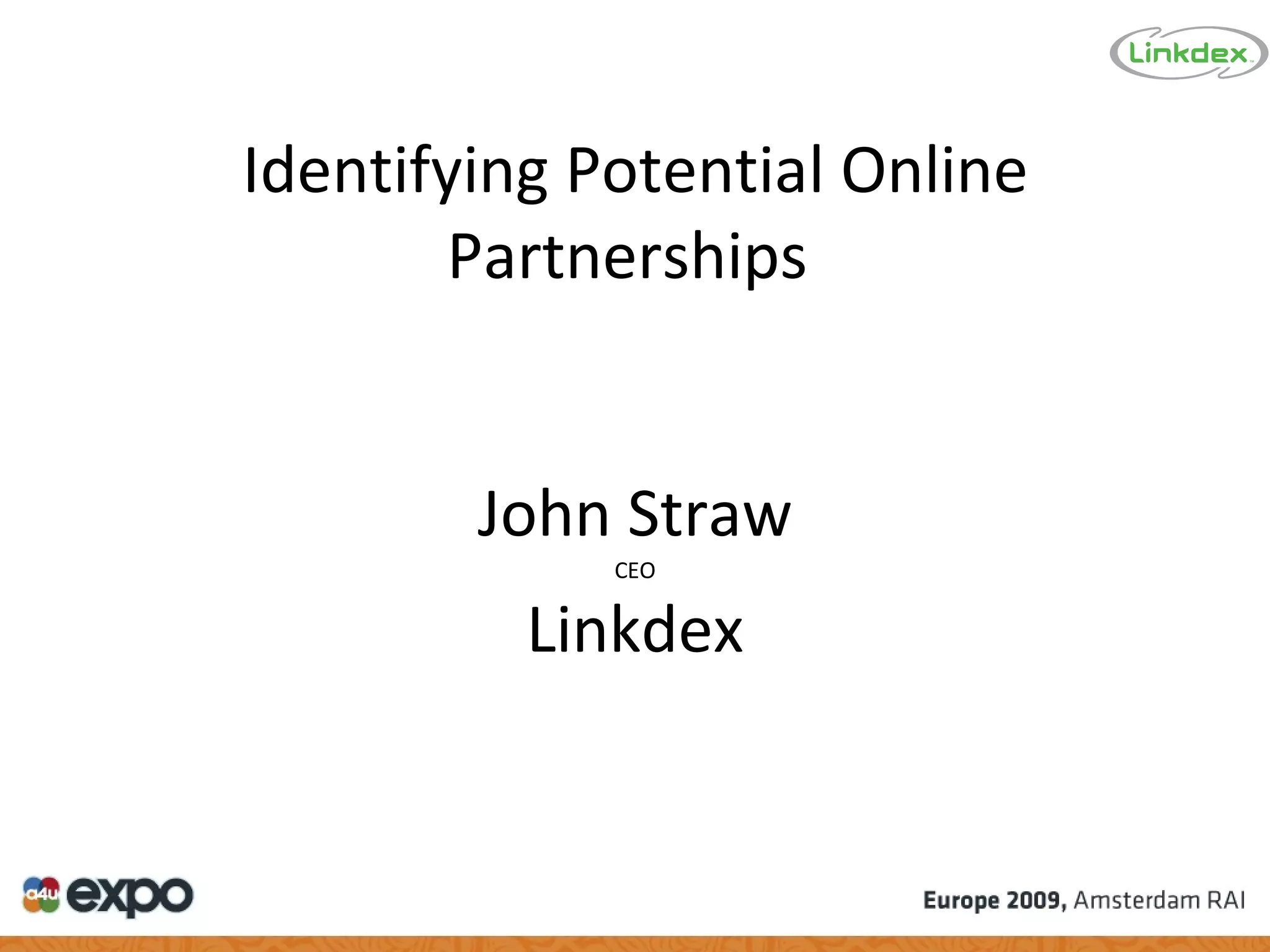 This document discusses identifying potential online partnerships. It outlines different types of partnerships including search, PR, and commercial partnerships. It then provides tips for finding new partners by using tools to identify highly linked sites with similar content, and sites targeting specific keywords. The document also gives advice on screening potential partners by checking pagerank, Alexa rankings, content density, site age, inbound/outbound links. It recommends using online tools to analyze these factors and find suitable partnership opportunities.