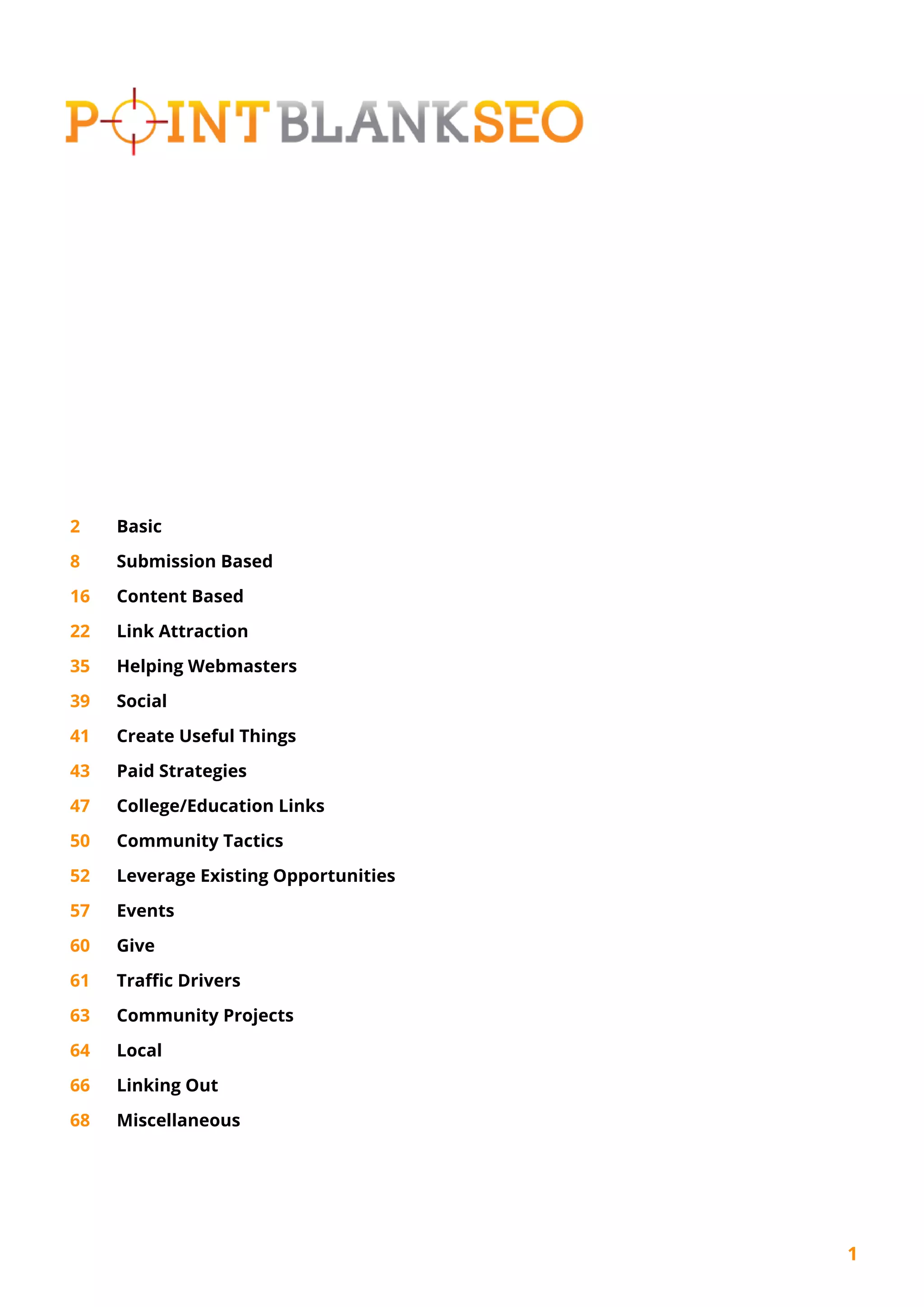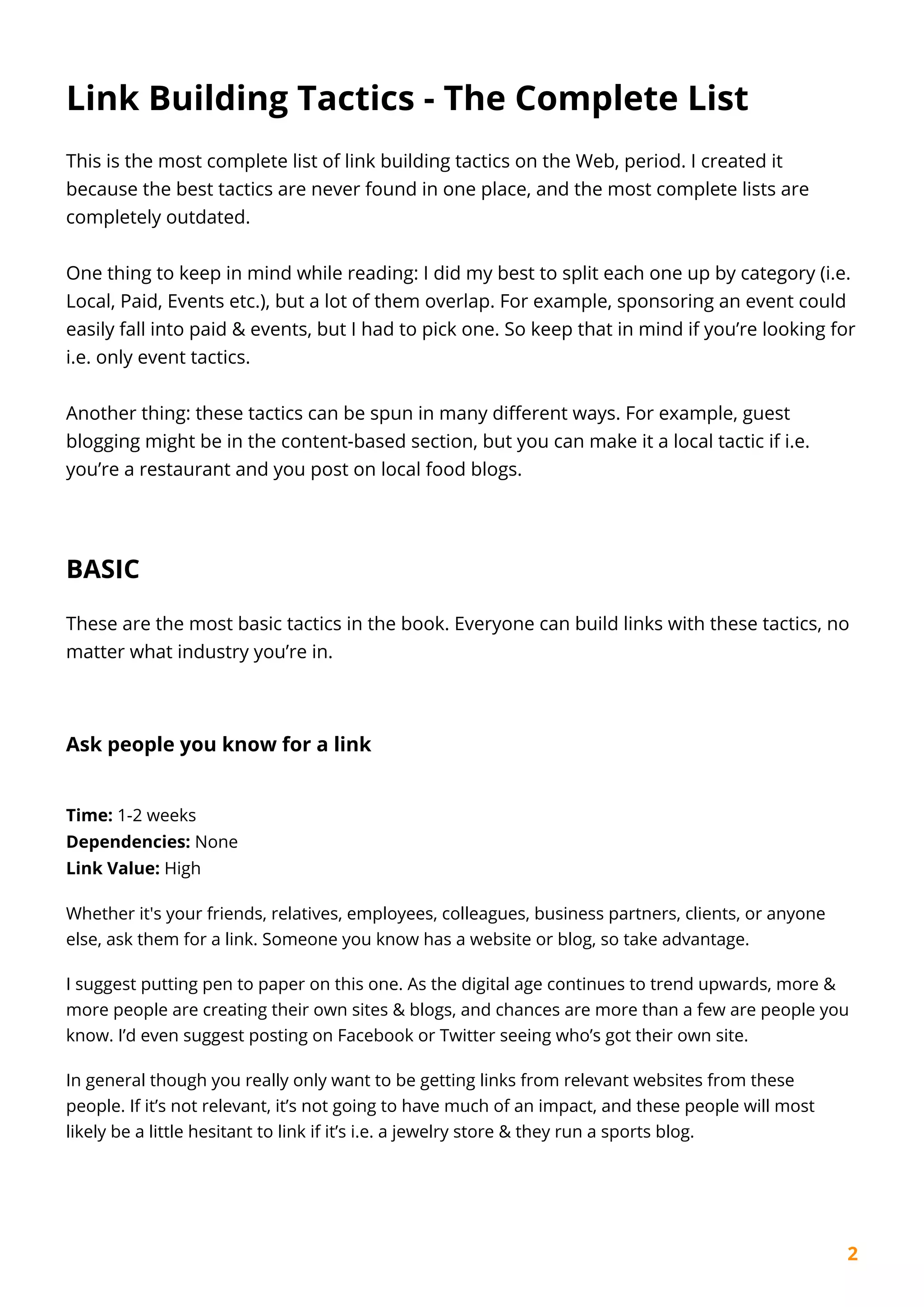 This document provides a comprehensive list of link building tactics organized into categories. It includes over 70 tactics ranging from basic strategies that require little effort like asking friends for links, to more advanced tactics like building relationships over time and leveraging existing opportunities. The tactics cover a wide scope of approaches including submission-based tactics to various directories, creating useful content and assets to attract links naturally, and focusing on community engagement and local opportunities. Maintaining relevance is emphasized as important for the effectiveness of the tactics.