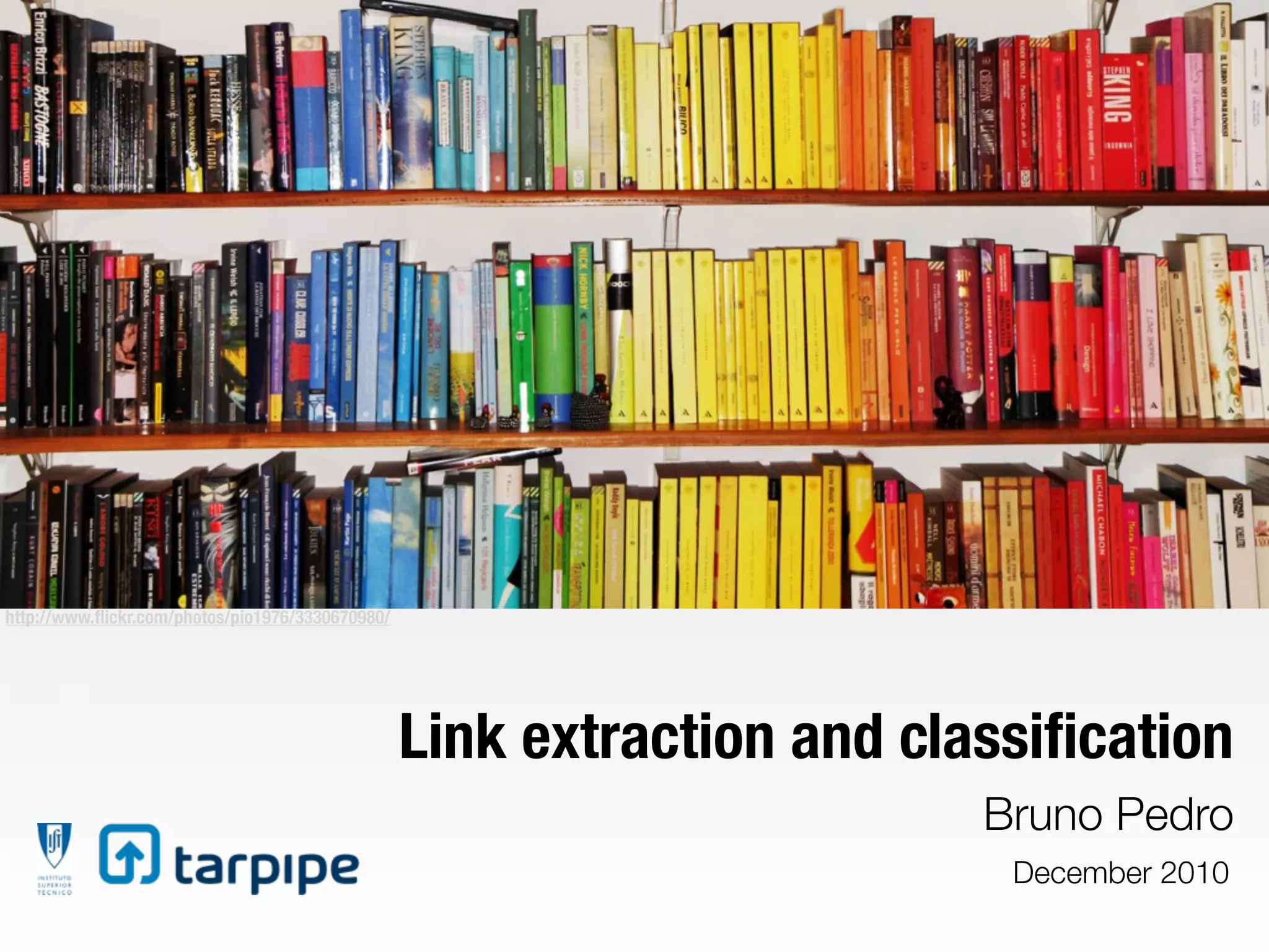 Bruno Pedro discusses link extraction and classification strategies using Tarpipe, a tool for processing large amounts of data from social media streams like Twitter. The document outlines techniques for immediate storage, content extraction, and classification of information received through tweets, emphasizing the need for efficient data handling. It also mentions various resources and APIs relevant to the topic.