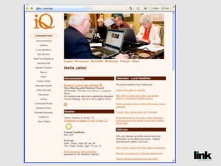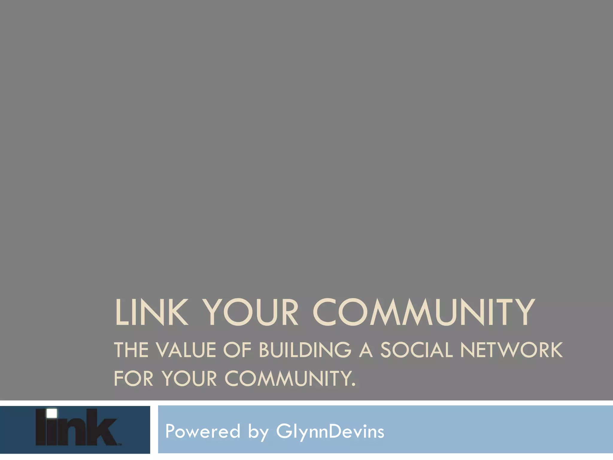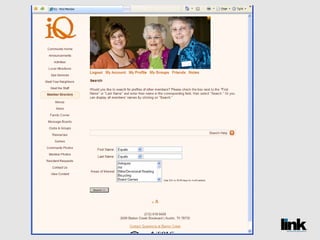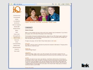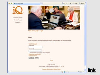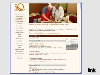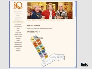 The document discusses the benefits of creating an online social network called LINK for senior living communities. It introduces LINK as a password-protected website that allows residents, staff, families and others to communicate, share information and build relationships. The document also notes that social media use is growing among older populations and that LINK can help communities save money while improving services.