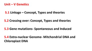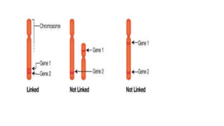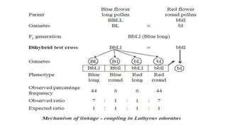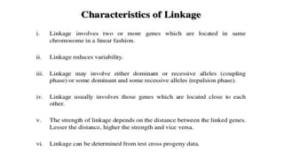 This document discusses genetic linkage and its related concepts and theories. It defines genetic linkage as the tendency of genes located near each other on the same chromosome to be inherited together. It describes Walter Sutton's hypothesis that chromosomes carry hereditary units and Sutton and Boveri's chromosome theory of inheritance. It also discusses Bateson and Punnett's coupling and repulsion hypothesis, Morgan's discovery of gene location on chromosomes through fly experiments, and the different types of linkage like complete and incomplete linkage. Examples are provided to illustrate concepts like complete and incomplete linkage.