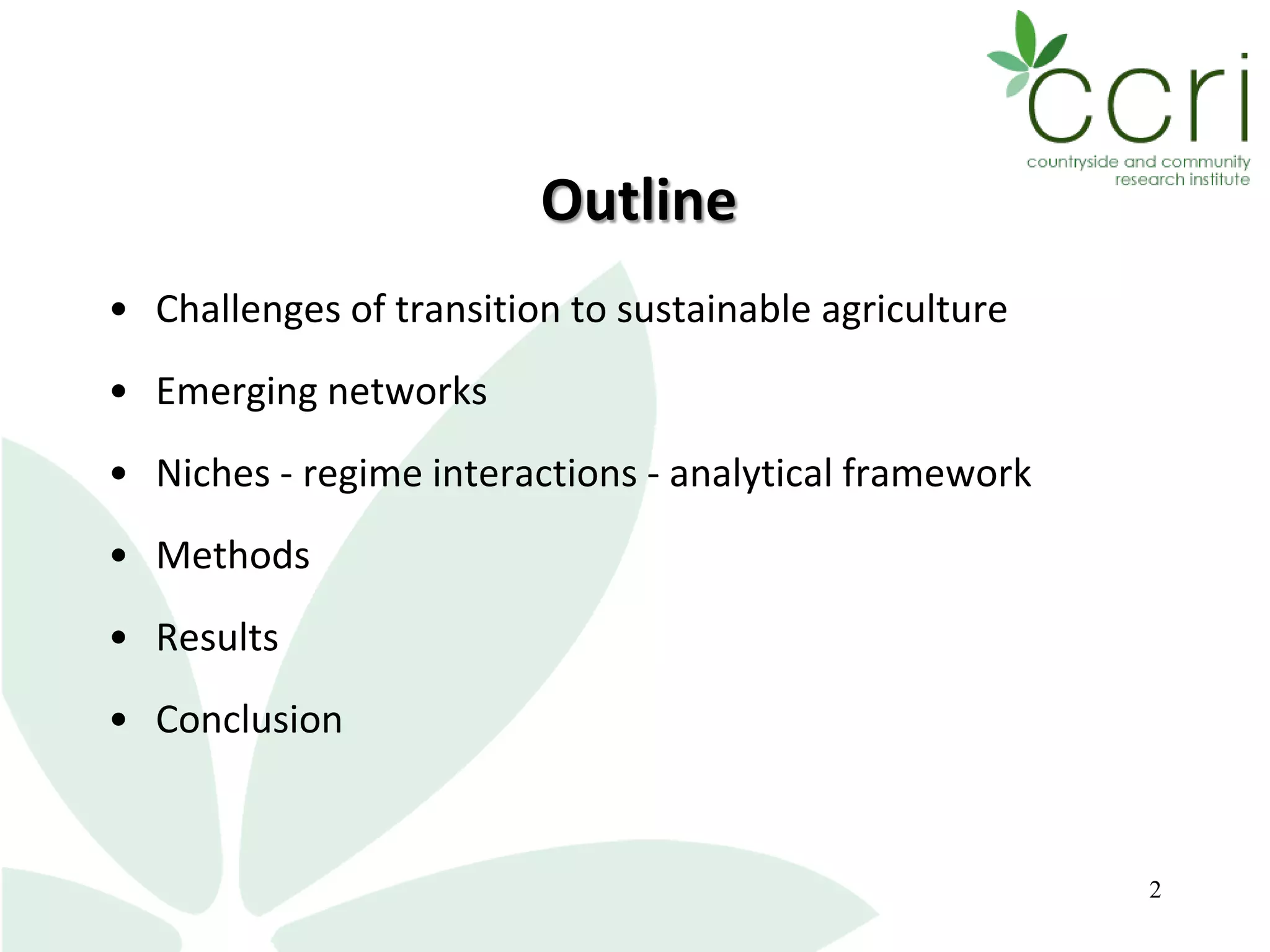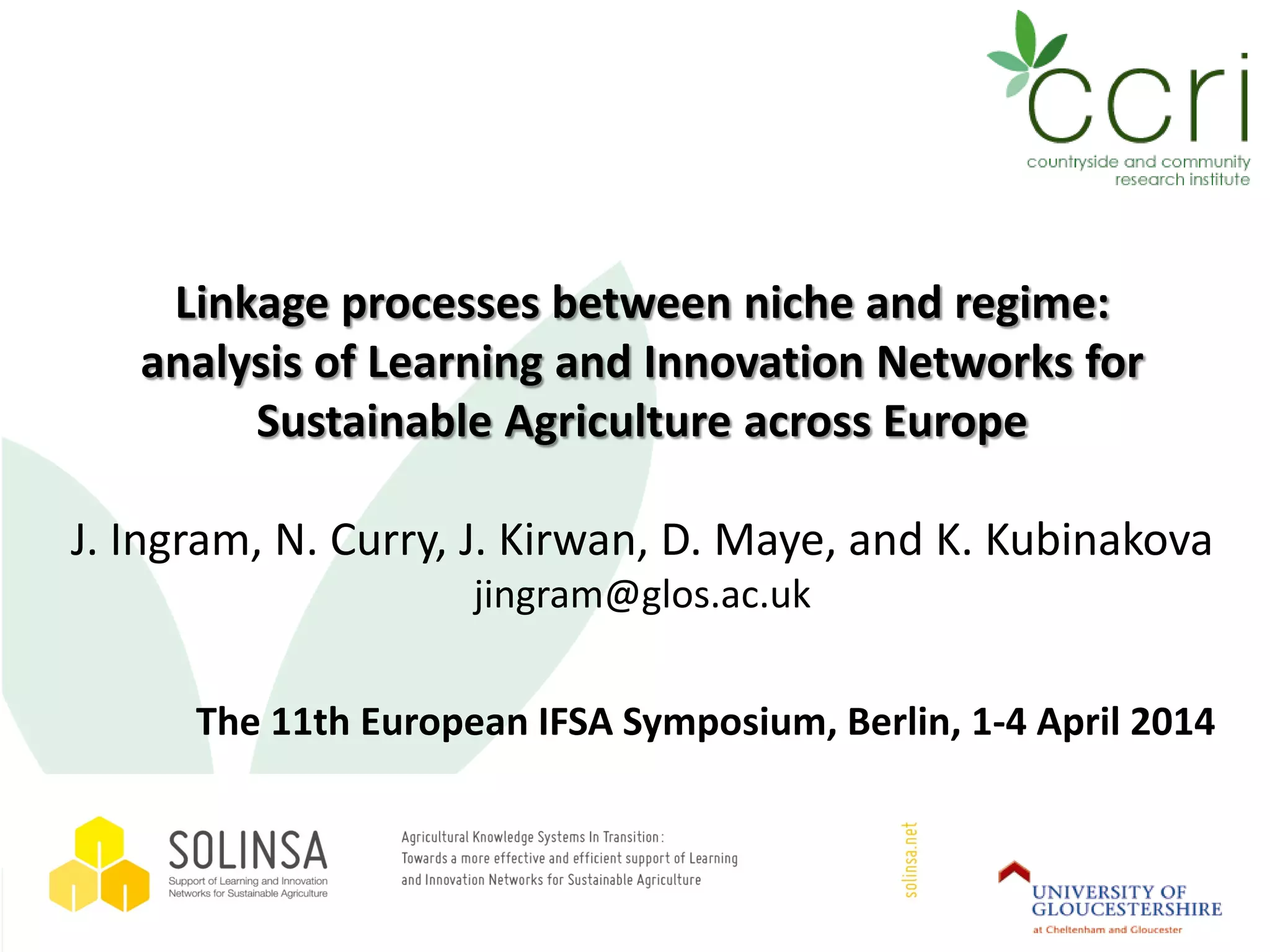 The document discusses the challenges of transitioning to sustainable agriculture, emphasizing the role of learning and innovation networks across Europe. It outlines how emerging networks, consisting of diverse actors, contribute to innovation and facilitate interactions between niche and regime through various modes of adaptation and accommodation. Ultimately, the analysis reveals that the transition is a complex process of interactive changes rather than a simple regime shift.