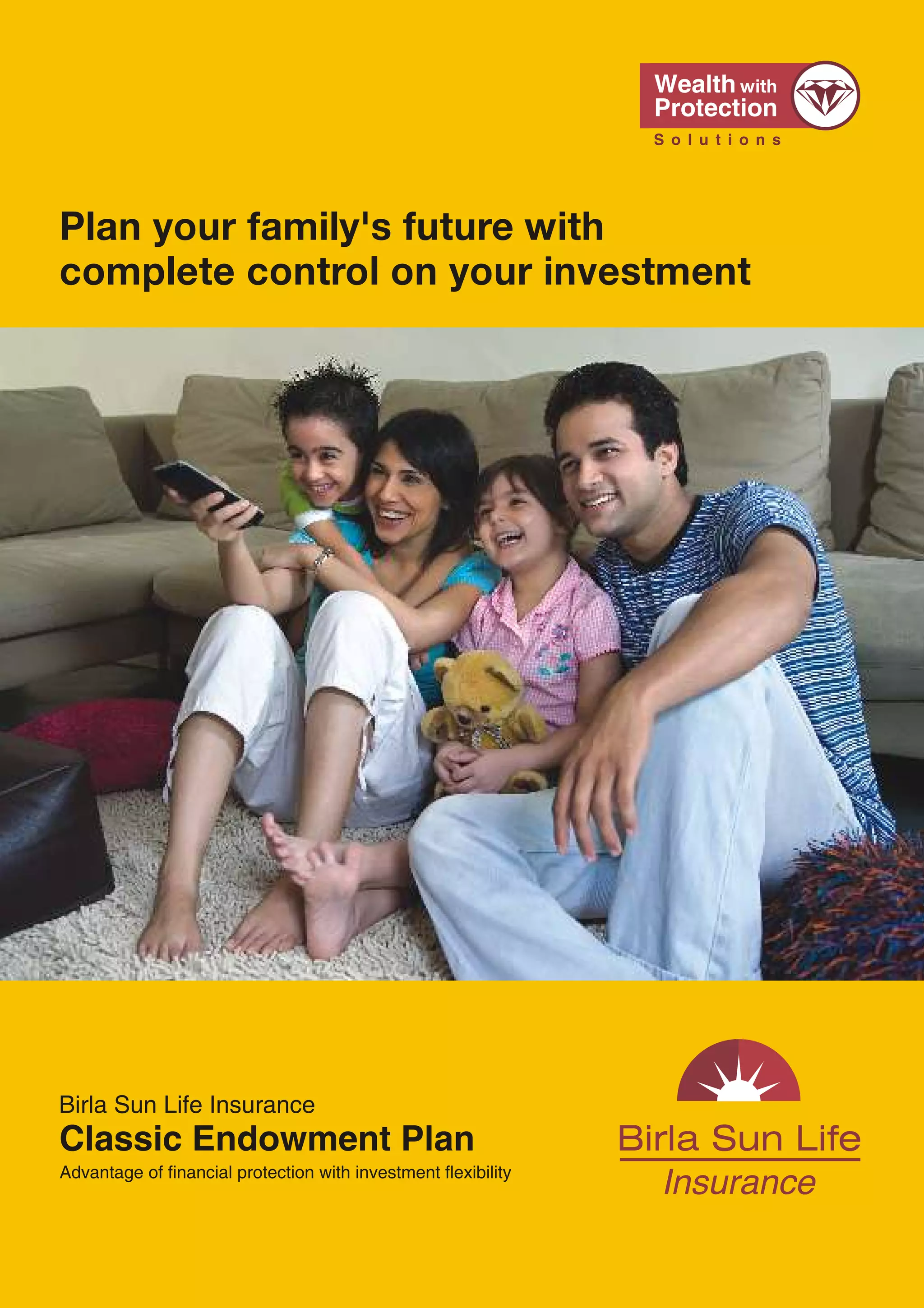 This document summarizes an investment plan from Birla Sun Life Insurance. The plan allows policyholders to plan for their family's future with control over their investment. Key features include choosing a savings date and premium amount, life cover, tax benefits, and investment flexibility including multiple funds and switching options. The plan has both investment risks and potential returns depending on market performance.