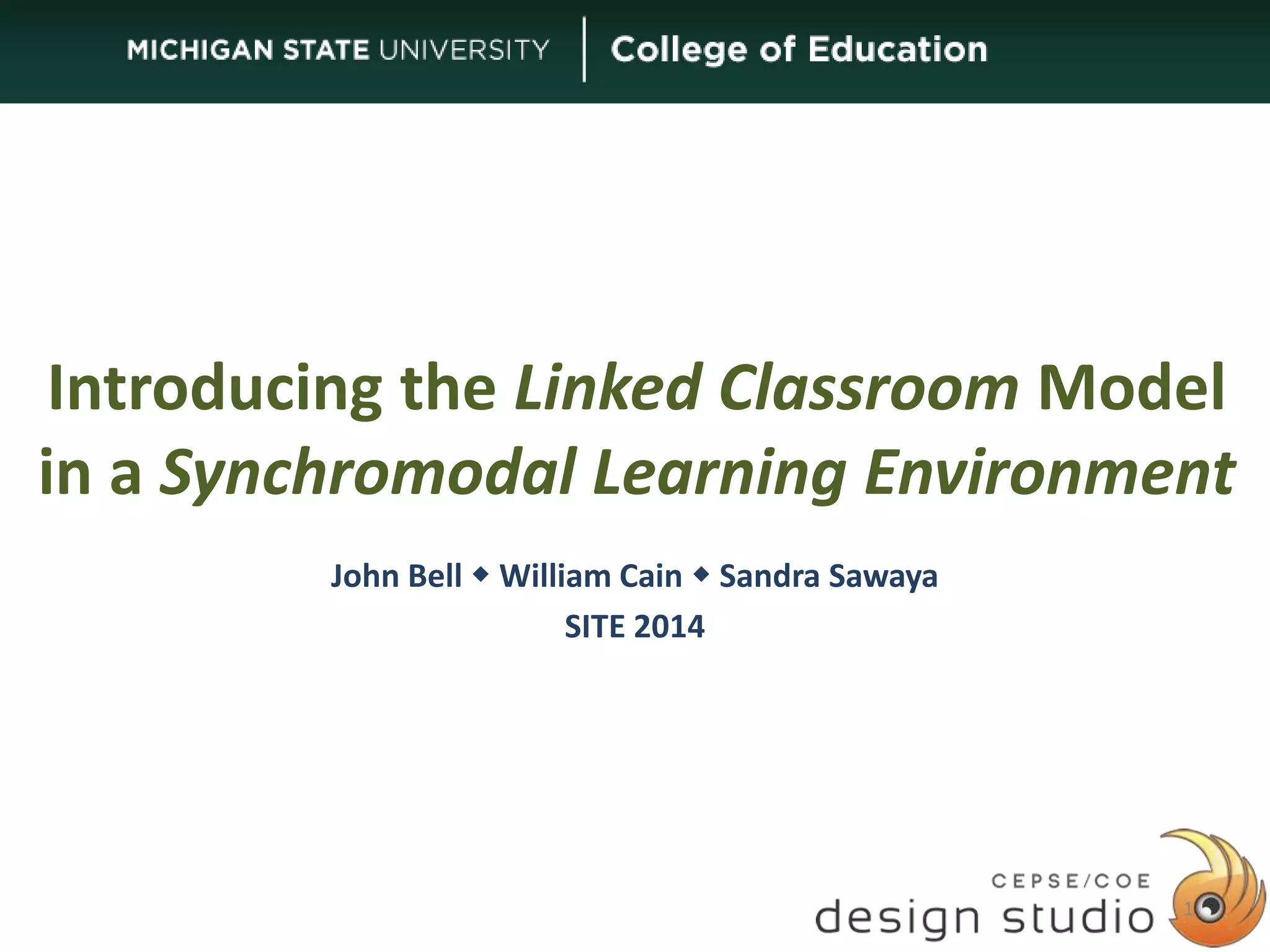 The document discusses the implementation of the linked classroom model within a synchromodal learning environment, where online and face-to-face students engage in real-time sessions. It highlights the challenges and solutions for enhancing access to education while maintaining effectiveness, emphasizing the importance of technology in facilitating interactions. Key considerations include camera placement, display setups, and the role of technology navigators to ensure successful learning experiences.