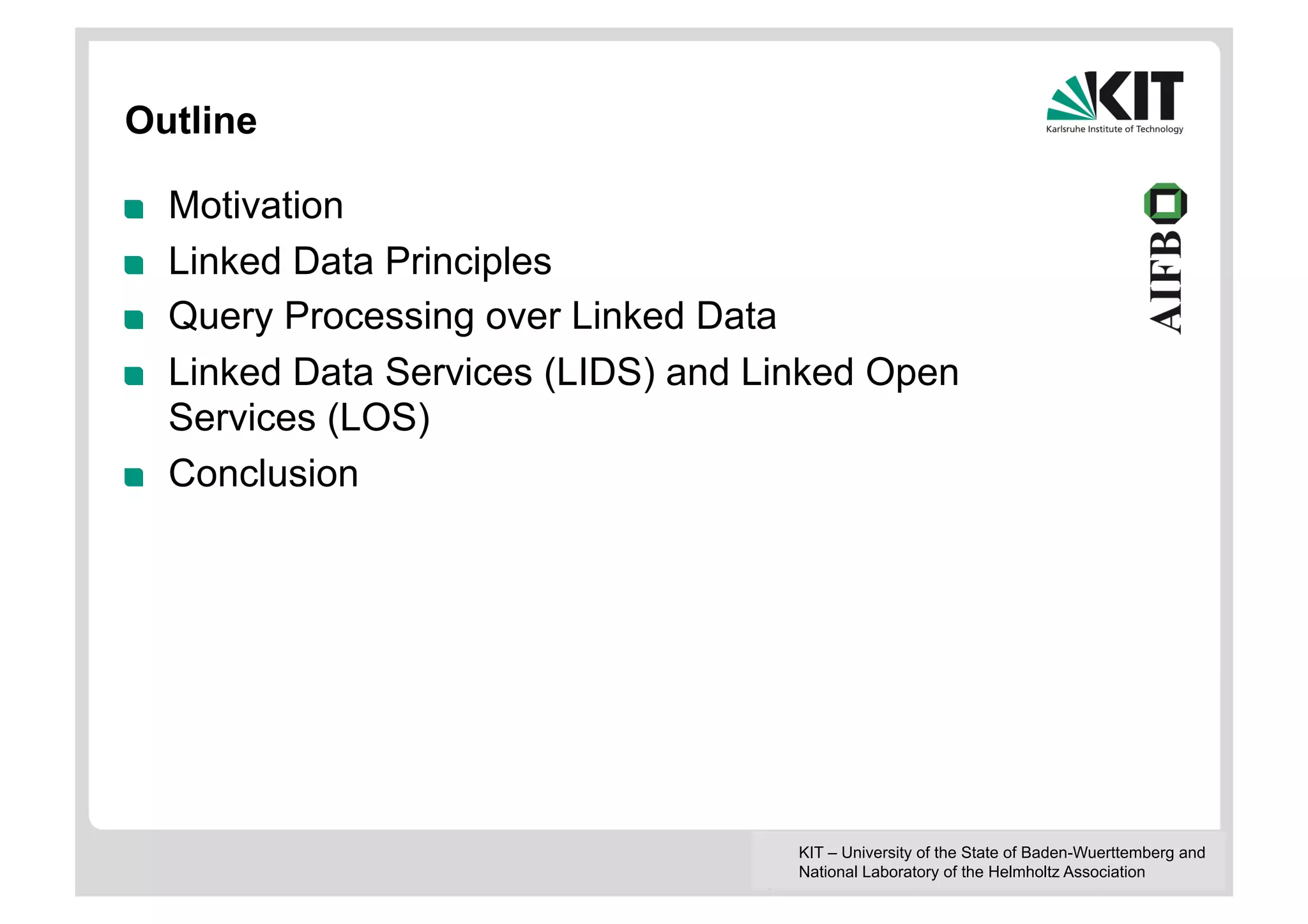 The document discusses linked data and services, emphasizing the principles of utilizing URIs for identification, HTTP URIs for data retrieval, and the provision of structured data in RDF format. It covers query processing methods for linked data, including distributed and materialization-based approaches, and outlines the integration of services with linked data through Linked Data Services (LIDs) and Linked Open Services (LOS). Additionally, it highlights the importance of machine-readable descriptions for data services and showcases examples of data querying and interlinking processes.