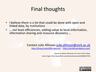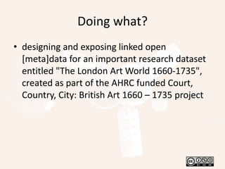 This document discusses the OpenART project which aims to expose structured metadata from the "London Art World 1660-1735" dataset as linked open data. The project is analyzing the dataset, modeling it using ontologies, and creating RDF triples with unique identifiers to describe entities like art sales, people, places, and artworks. By publishing this structured data on the web using semantic web standards, it will enable others to more easily discover and integrate this information into their own applications and research.
