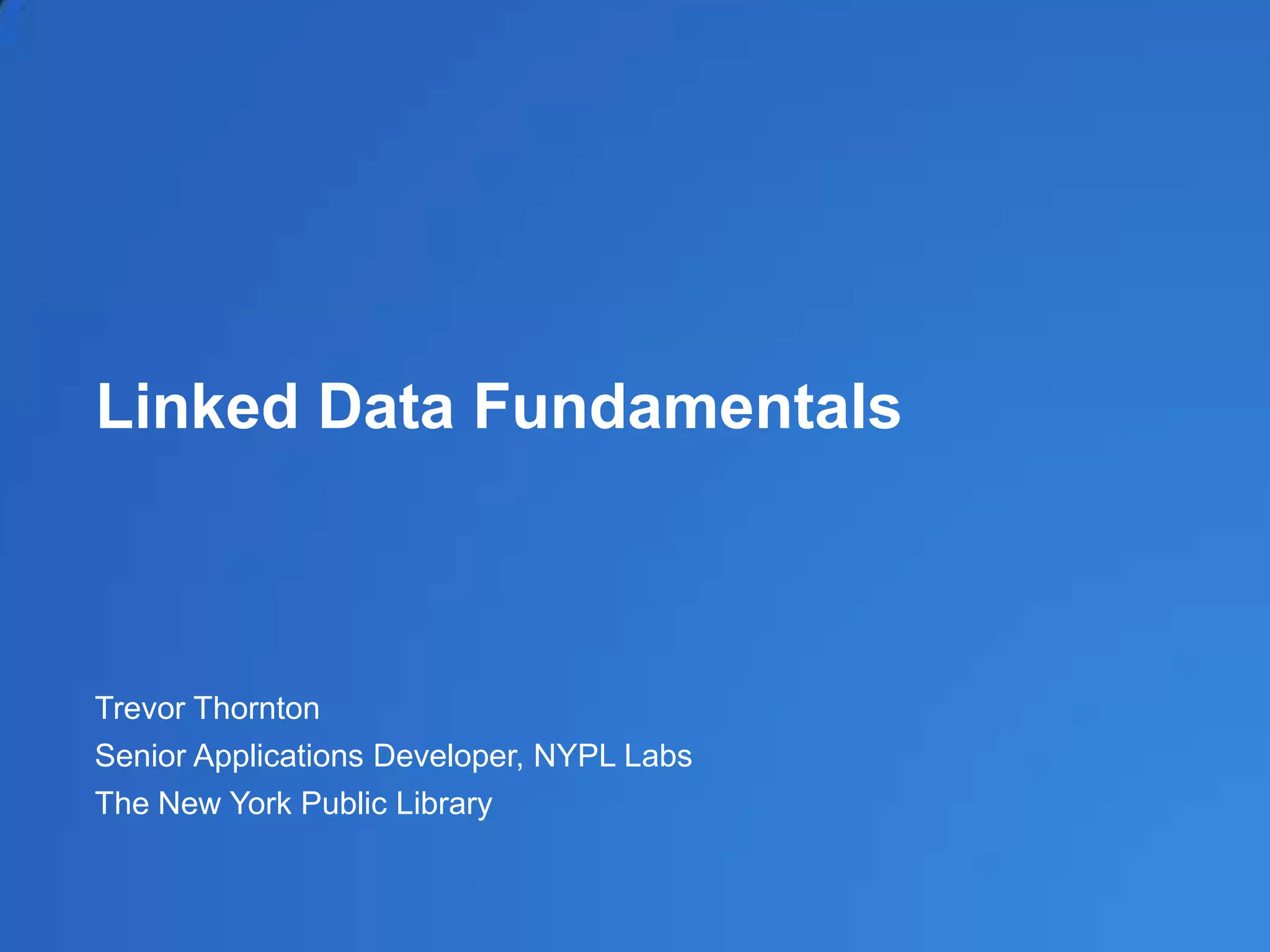 The document provides an overview of linked data fundamentals, including key concepts like URIs, RDF, ontologies, and the semantic web. It discusses aspects of linked data such as using HTTP URIs to identify resources, representing data as subject-predicate-object triples, and connecting related resources through links. It also covers RDF serialization formats, ontologies like RDFS and OWL, and notable linked open data sources.