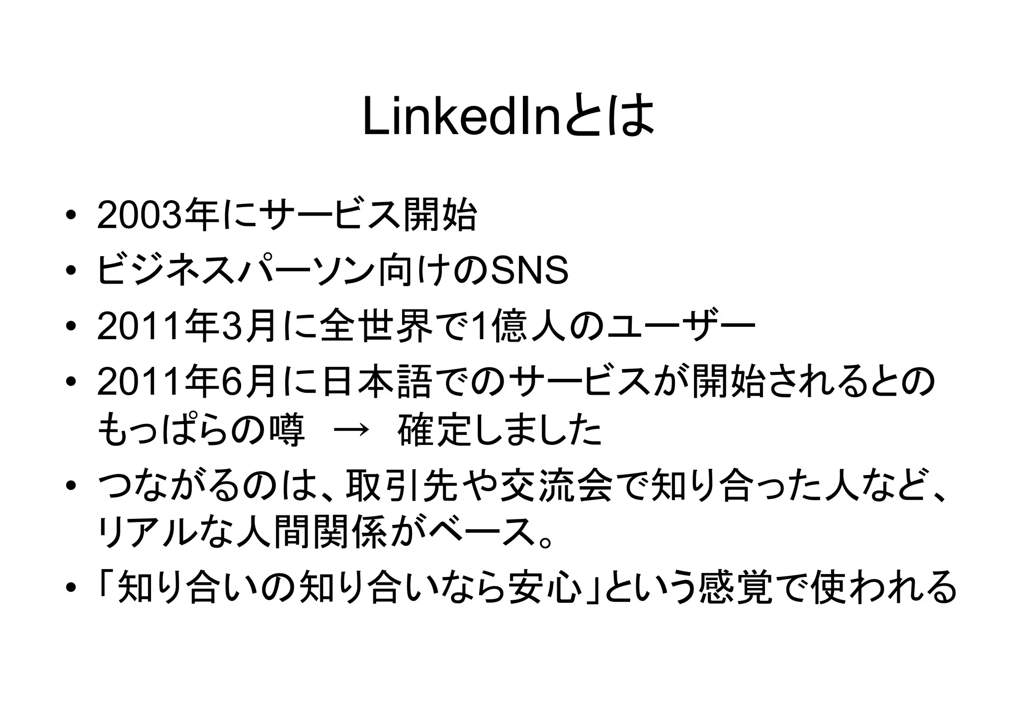 2011年3月に全世界で1億人のユーザー • 2011年6月に日本語でのサービスが開始されるとの もっぱらの噂 → 確定しました • つながるのは、取引先や交流会で知り合った人など、 リアルな人間関係がベース。 • 「知り合いの知り合いなら安心」という感覚で使われる