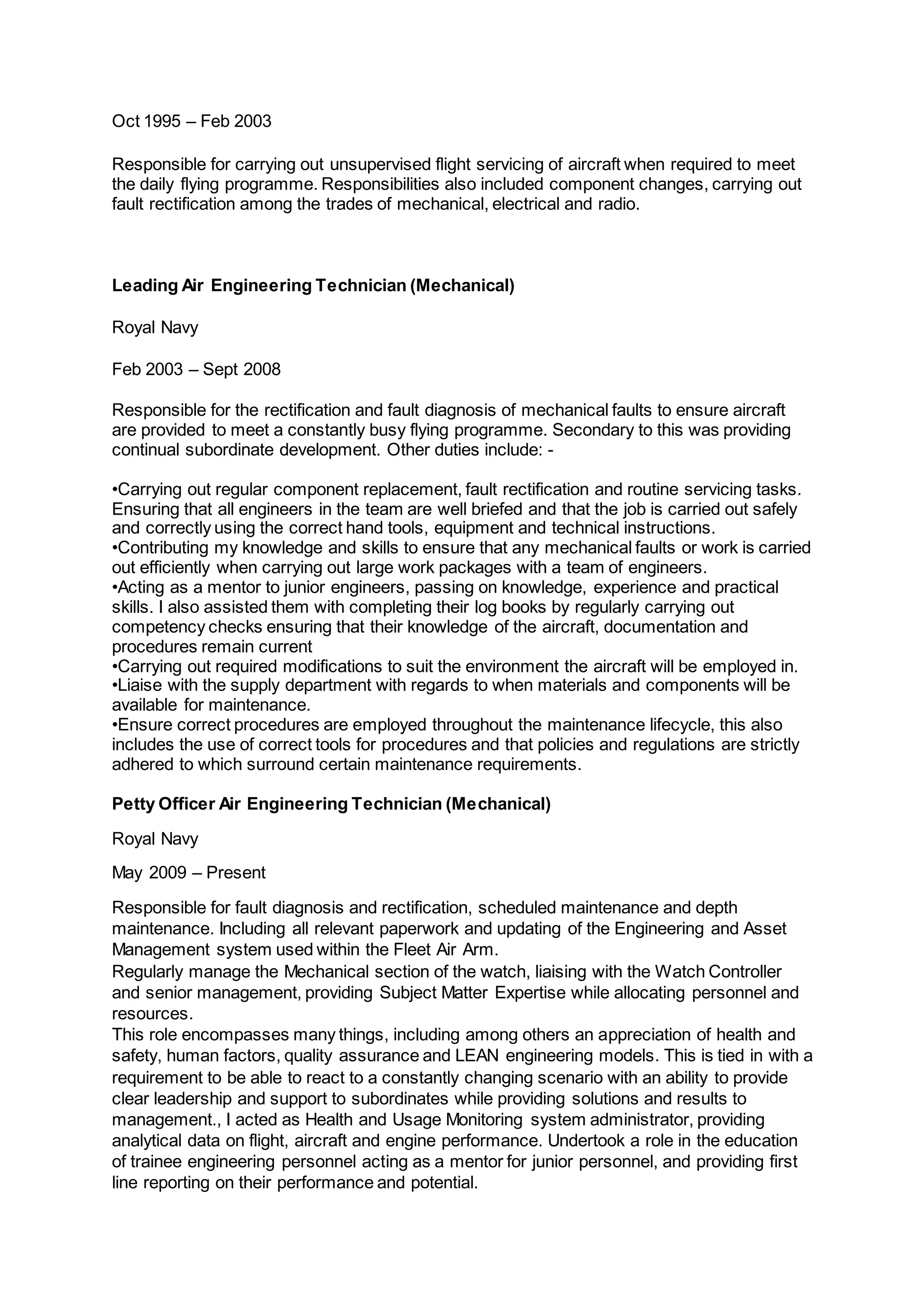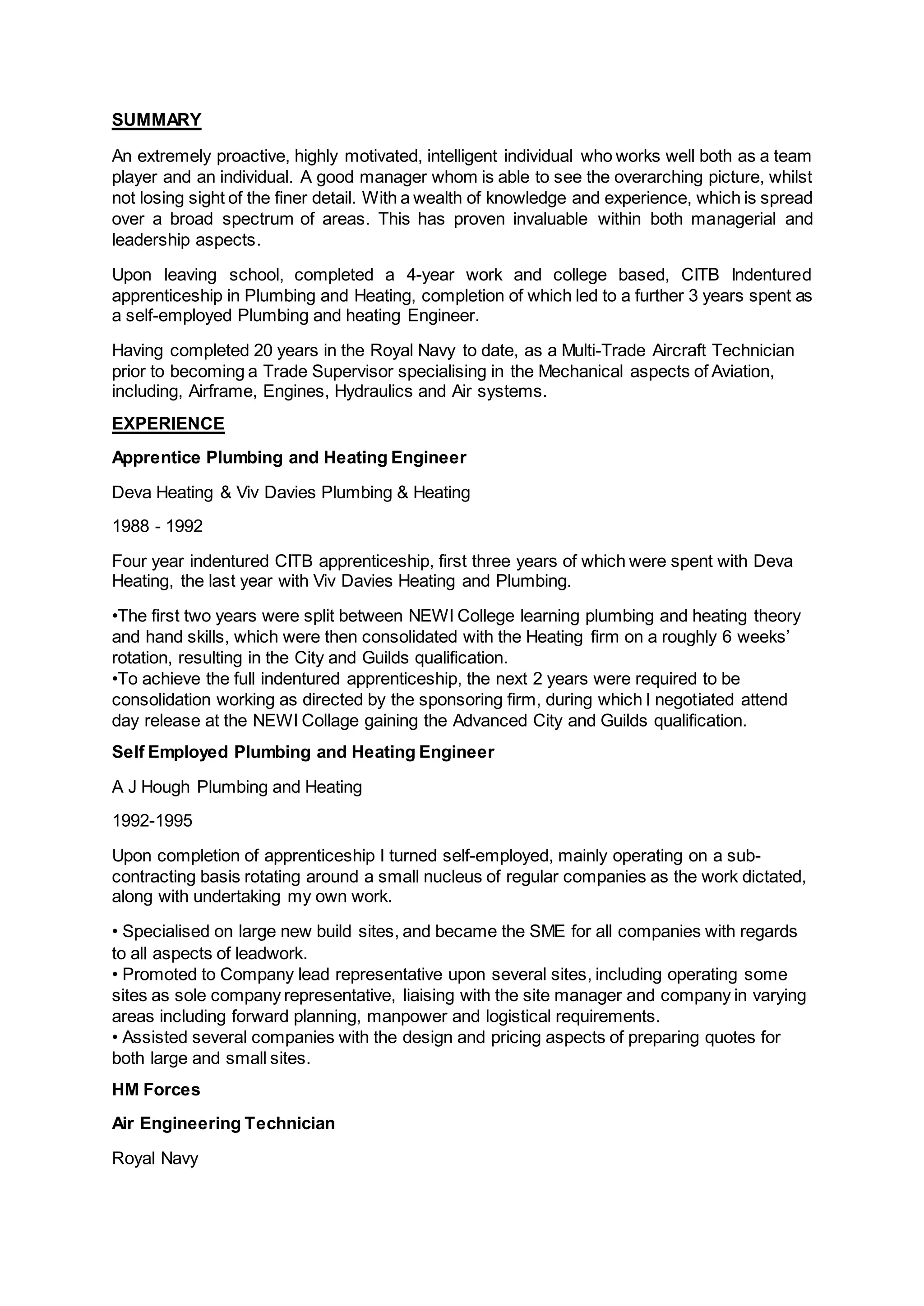 This document provides a summary of an individual's experience, including 20 years of experience in the Royal Navy as an aircraft technician and supervisor specializing in mechanical systems. They have additional experience as an apprentice plumber/heating engineer and as a self-employed plumbing/heating contractor before joining the military. More recent roles have included instruction, quality assurance management, and maintenance planning and coordination.