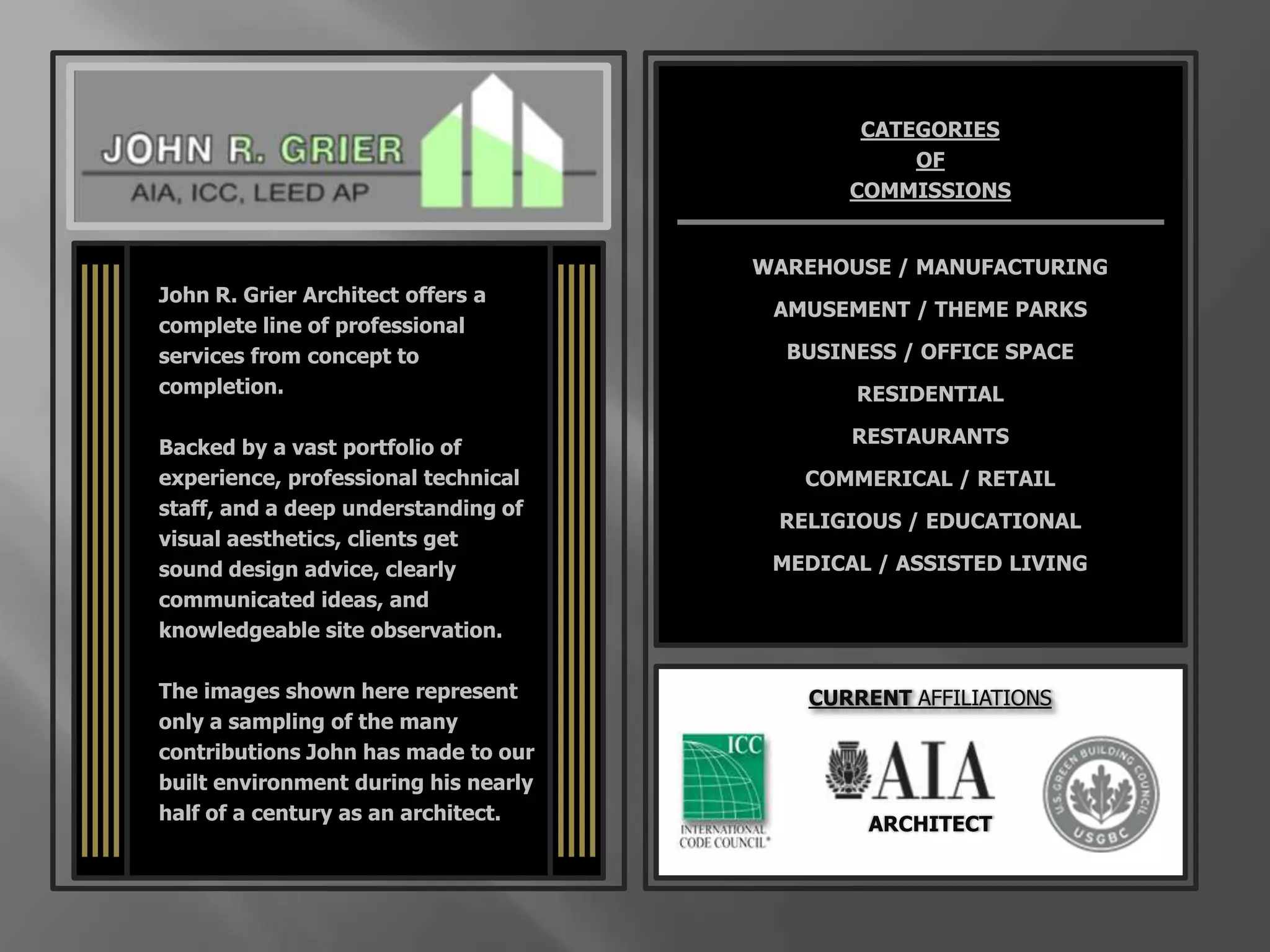 The document lists categories of commissions for an architect including warehouse/manufacturing, amusement/theme parks, business/office space, multi-family residential, restaurants/theme parks, commercial/retail, religious/educational, and medical/assisted living. It also lists the architect's current affiliations.