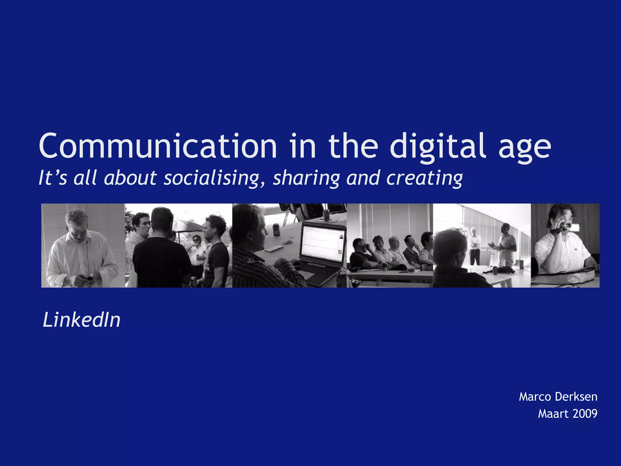 The document discusses the professional social media platform LinkedIn. It provides statistics on LinkedIn's user base of over 35 million worldwide and over 1 million in the Netherlands. It then outlines some of LinkedIn's key features for connecting with other professionals, including creating a profile, joining groups, advertising jobs, and communicating via messaging. The purpose of LinkedIn is to enable users to strengthen their professional network and advance their careers through online networking and relationship-building on the platform.