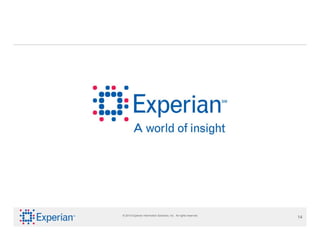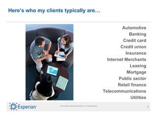 The document summarizes the services provided by Experian, a company that helps clients in various industries with analytics, risk management, and fraud prevention. It discusses Experian's clients, capabilities, and case studies showing how it has helped automotive, banking, and other clients improve collections, reduce fraud and costs, and optimize decisions. Experian competes with Equifax and other companies and has experienced sales and profit growth in recent years.