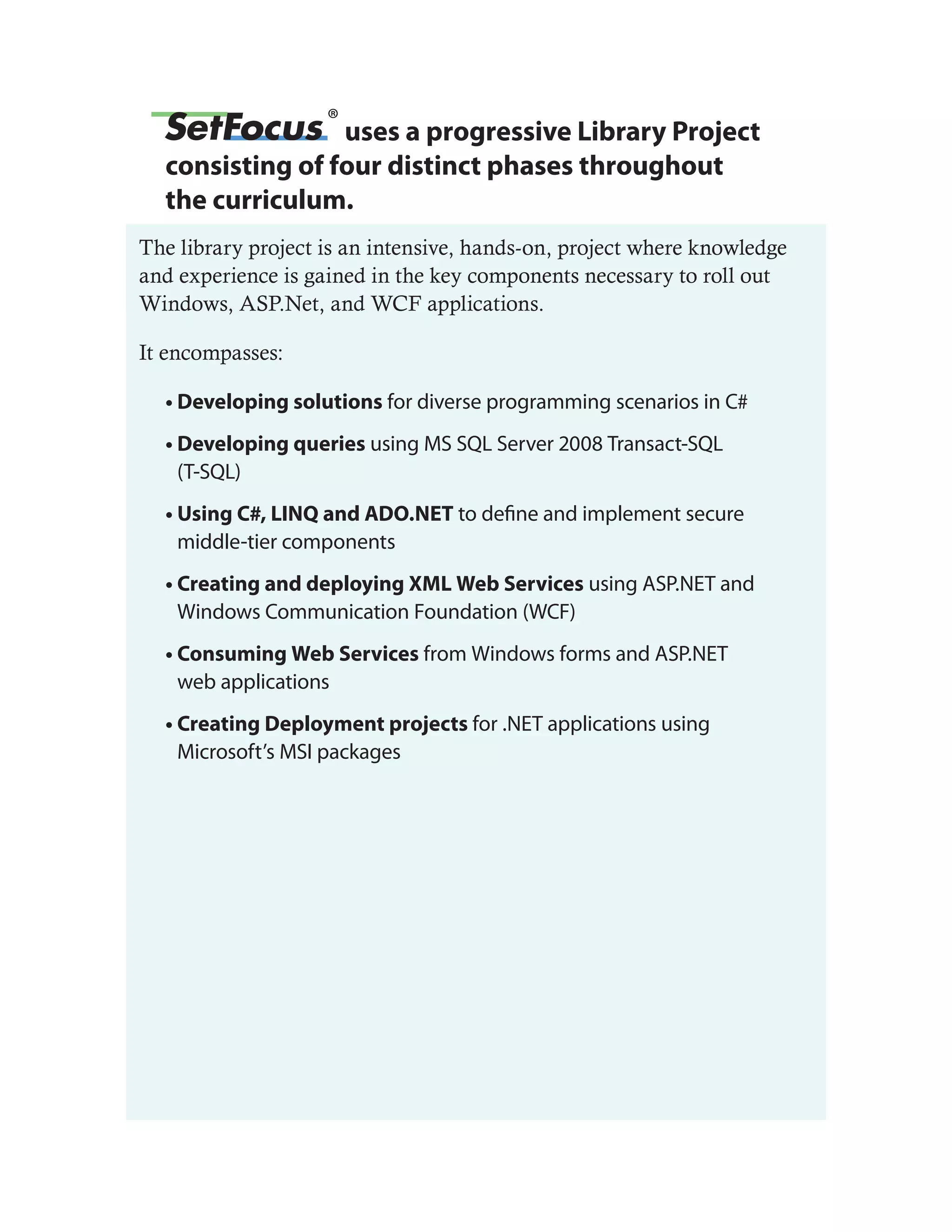 The library project involves developing Windows, ASP.NET, and WCF applications across four phases, starting with a Windows front end for library functions and moving to a web application, then implementing data access using LINQ and ADO.NET before creating a WCF service that utilizes security to allow interoperability with other library systems.