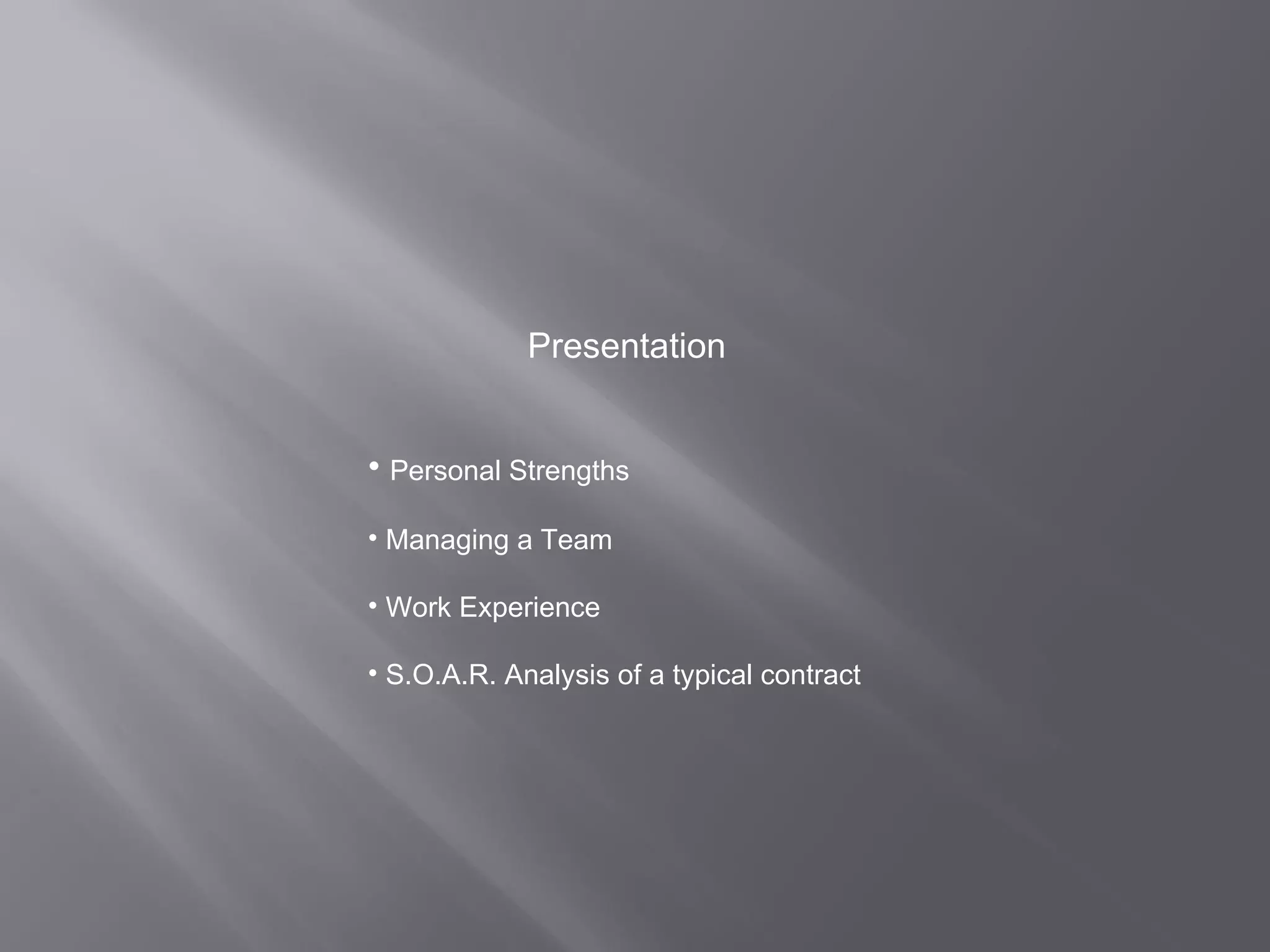 The document discusses the candidate's personal strengths and experience managing teams and contracts. It outlines their experience in facilities management, project management, health and safety, financial management, and developing staff. It also provides an example scenario of managing an office expansion project for a major data center operator, including preparing bids, addressing customer needs, overseeing subcontractors, managing budgets and timelines, and developing strong customer relationships.