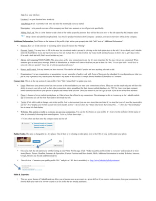The document provides detailed guidelines for optimizing LinkedIn profiles, focusing on settings, profile sections, and personal branding. Key areas include adjusting privacy settings, enhancing the profile headline, listing expertise, and updating contact information and experience. The document emphasizes the importance of strategic visibility and interaction to maximize professional networking opportunities.