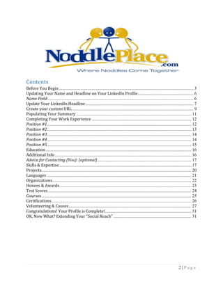 This document provides guidance on completing and optimizing your LinkedIn profile. It includes tips on updating your name, headline, profile photo and custom URL. It also provides examples and character limits for filling out key sections like summary, work experience, education and additional information. The document advises backing up your profile, turning off activity broadcasts before editing, and rearranging sections as needed. Completing these recommended profile fields can help improve searchability and connections on LinkedIn.