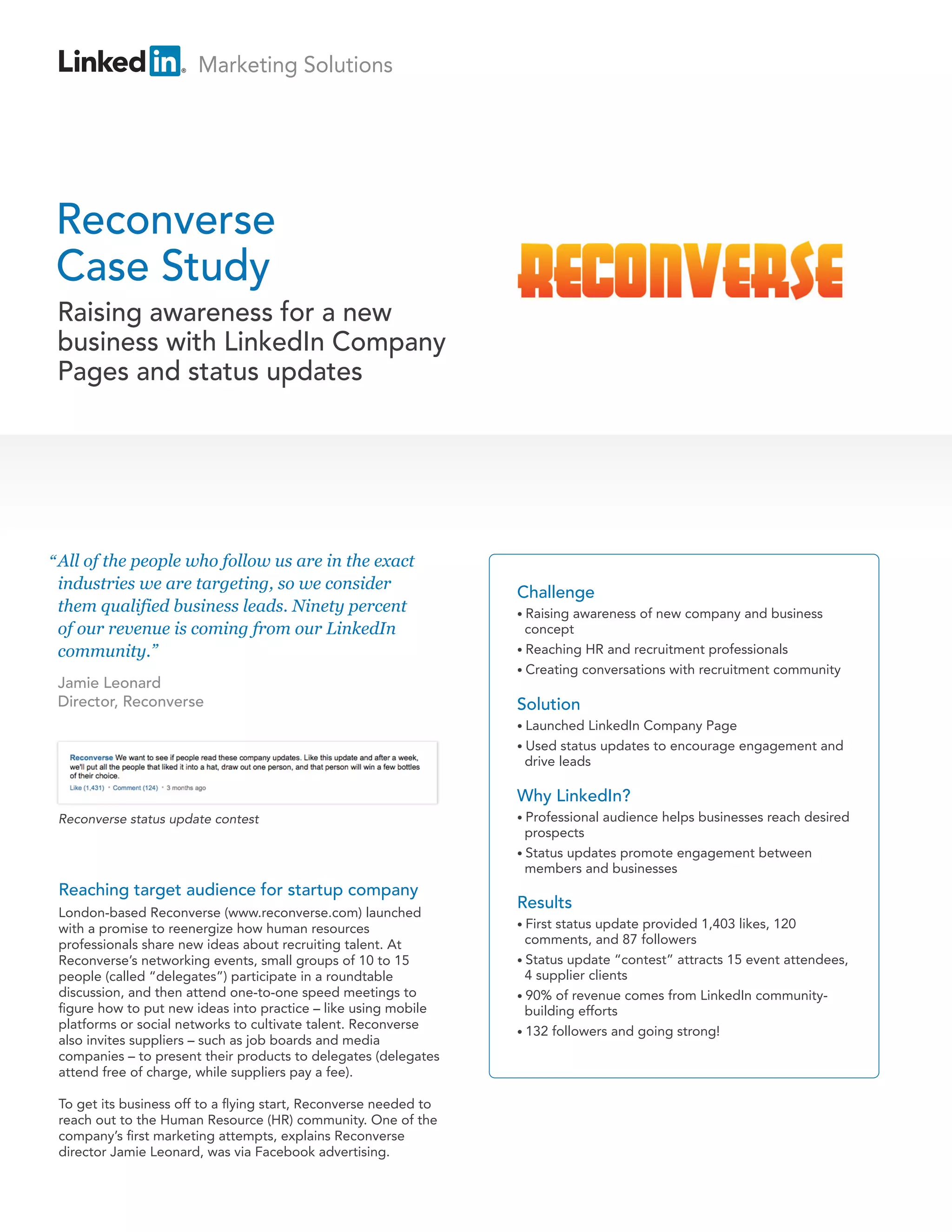 The document discusses how Reconverse successfully utilized LinkedIn to raise awareness for its HR-focused business, generating significant engagement through status updates which attracted qualified leads and community interaction. Their marketing efforts yielded a substantial following and revenue, primarily from LinkedIn, surpassing other platforms like Facebook. The case study emphasizes the importance of platform choice and engaging content in reaching target audiences effectively.