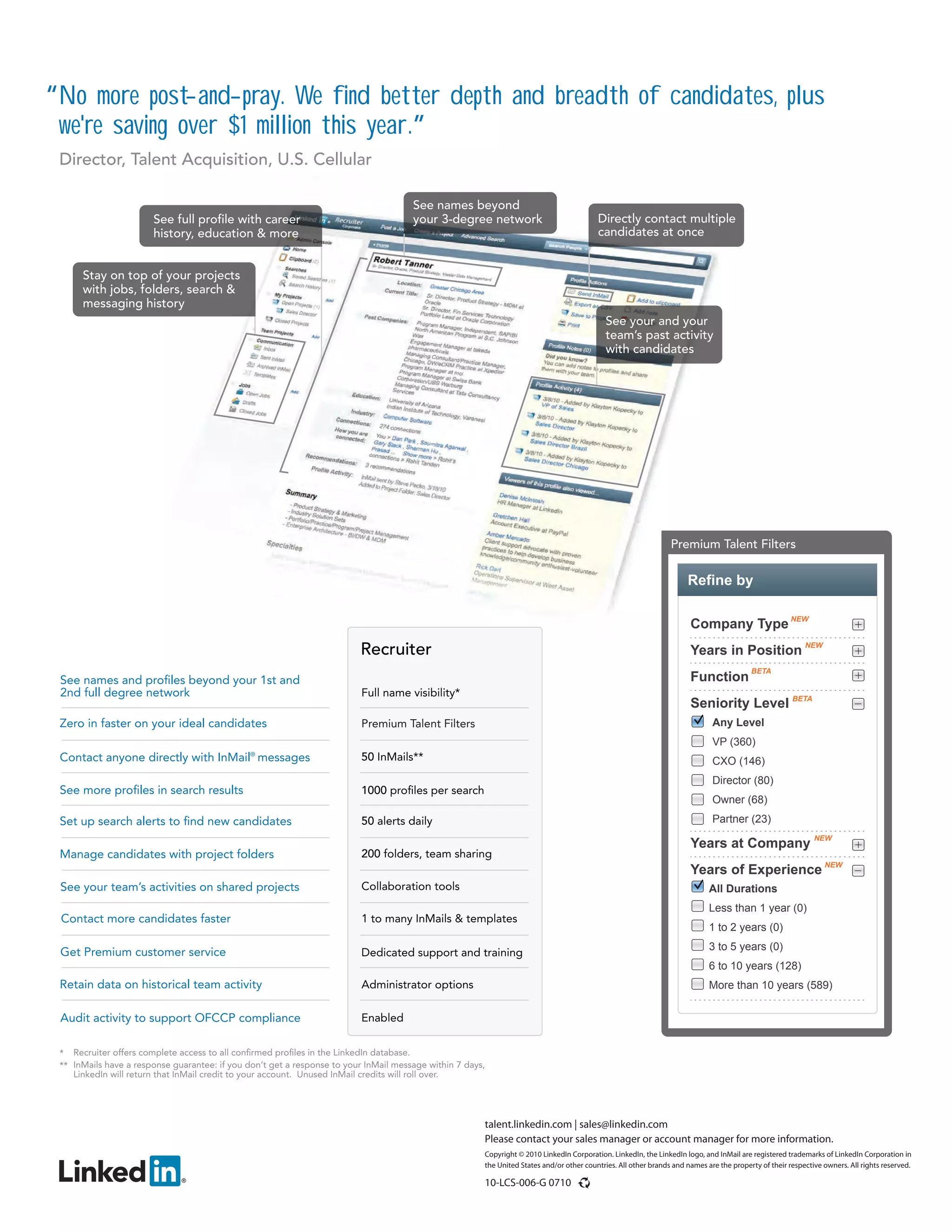 LinkedIn Recruiter provides recruiting solutions and tools to help recruiters find and contact qualified candidates more efficiently than other methods. Key features include unlimited access to candidate profiles, advanced search capabilities, the ability to directly contact candidates, tools to manage recruiting pipelines and collaborate with team members, and support from LinkedIn experts.