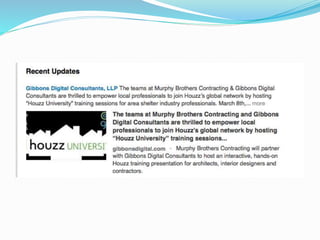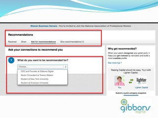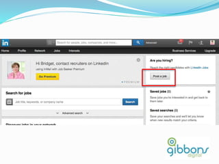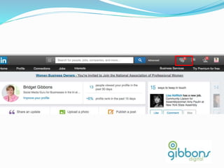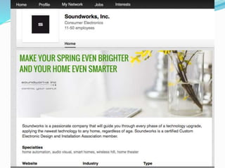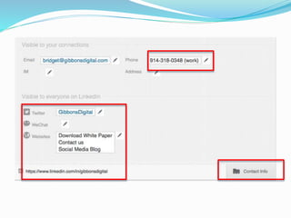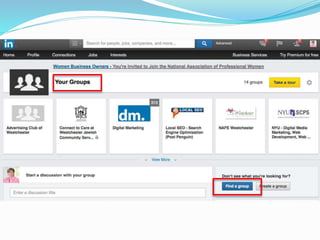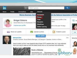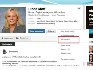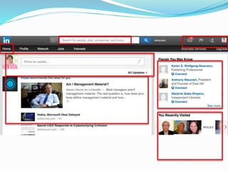 The document provides information on using LinkedIn to grow a professional network, build an optimized profile, interact with connections, find people and jobs, and more. It highlights key aspects of profiles like including an executive summary, skills, experience and recommendations to appear in more searches. It also outlines best practices for posting regular status updates, participating in groups, and using LinkedIn jobs and messaging functions to further business goals.