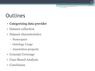 The document outlines an analysis of 25 datasets collected from the Data.gov catalog. It categorizes the data providers, describes the dataset characteristics including namespace, ontology usage and annotation properties. It analyzes the concept coverage across datasets and performs case-based analysis of 3 datasets from the Department of Veterans Affairs to show similarities in concepts like state, city, and VISN codes. The conclusion notes the lack of a coherent government ontology and inconsistent vocabulary usage across datasets.
