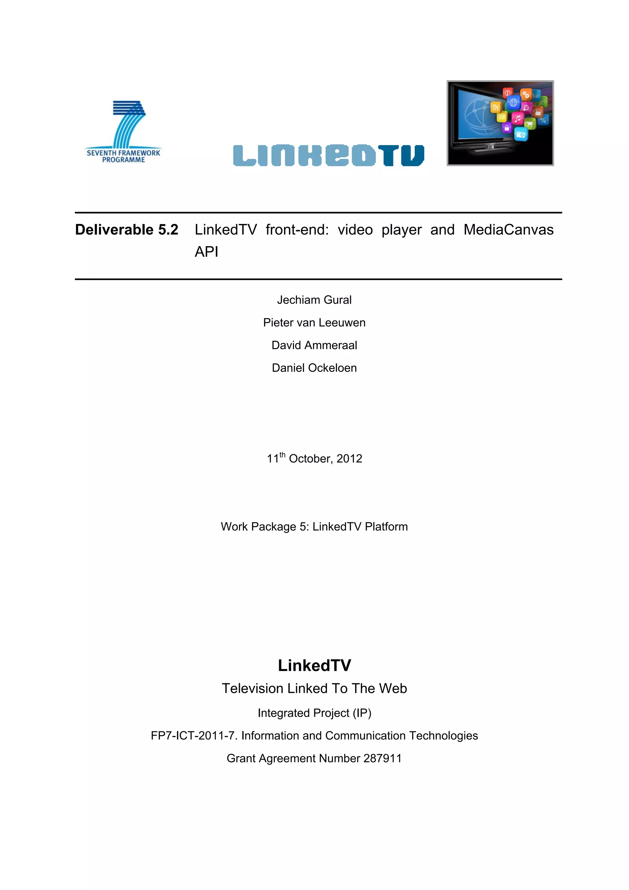 This document describes the design and current status of the LinkedTV Media Player and MediaCanvas API. The Media Player is developed by Noterik BV to support various media resources and user interactions. It is based on HTML5, supports playback on different devices, and complies with the W3C Media Fragments standard. The document outlines the prototype architecture, demonstrates user scenarios using mockups, and discusses the technical implementation and integration with the LinkedTV platform. Current status and plans for an HbbTV variant are also presented.