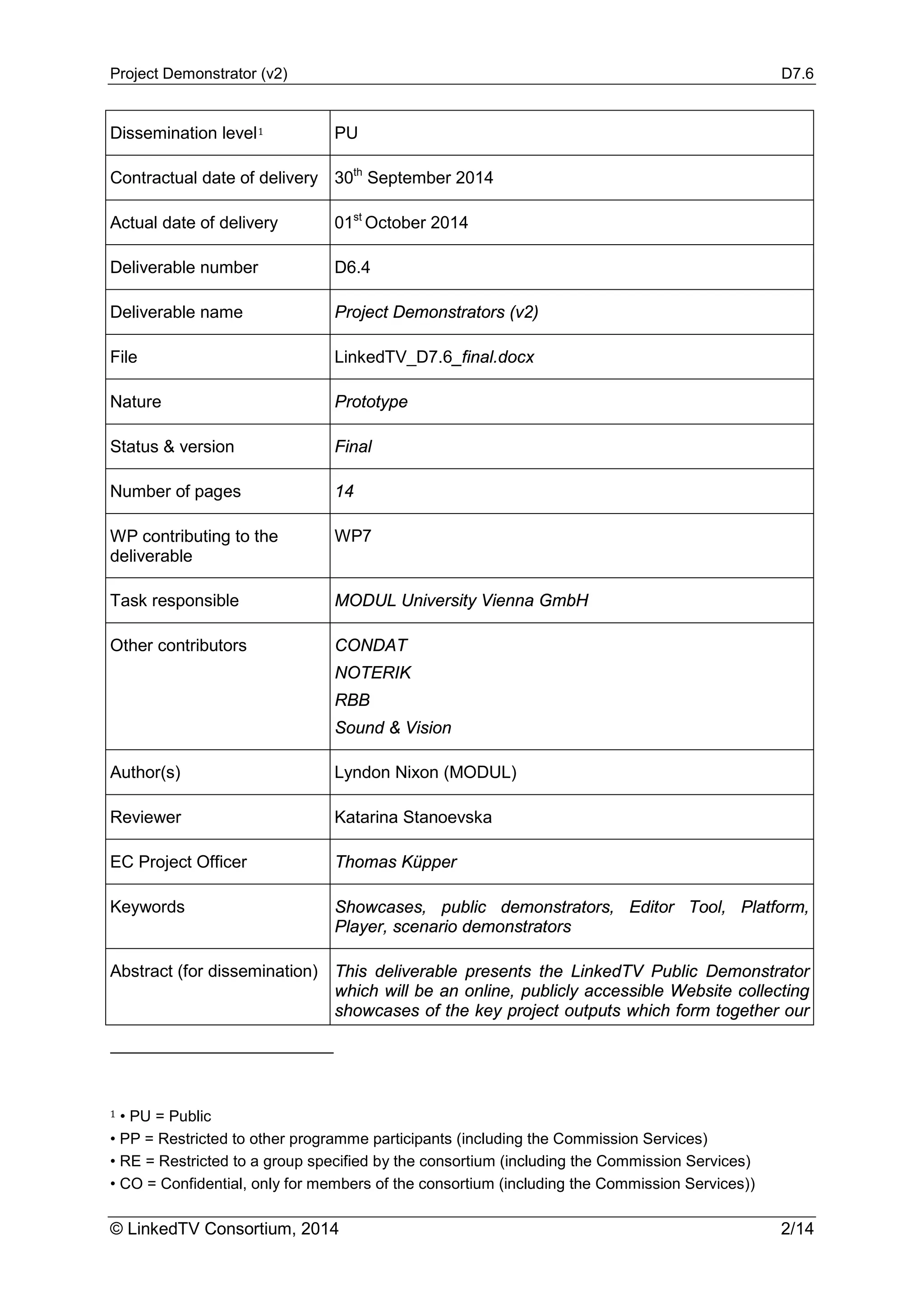 The document outlines the LinkedTV project demonstrator, an online platform showcasing key outputs, including an editor tool, platform, and player, aimed at providing public access to linked television technologies. It details the organization of the website to offer a simplified experience for both general users and potential technology adopters, featuring explanations and demos. The public demonstrator was launched on September 11, 2014, and aims to enhance viewer understanding of linked television while offering hands-on experiences and fostering further project dissemination.